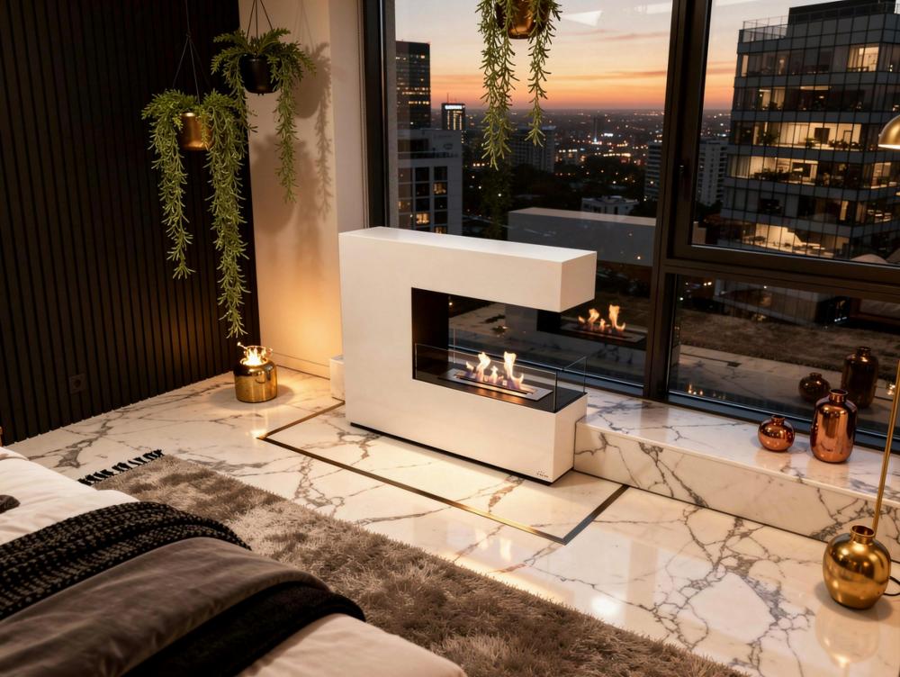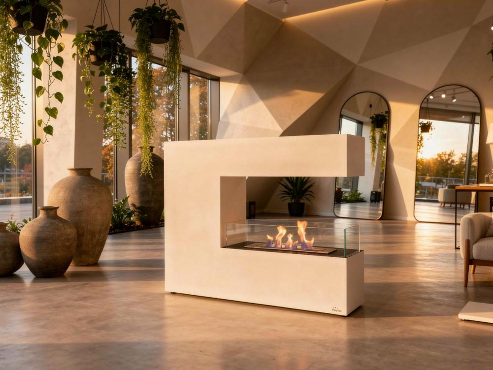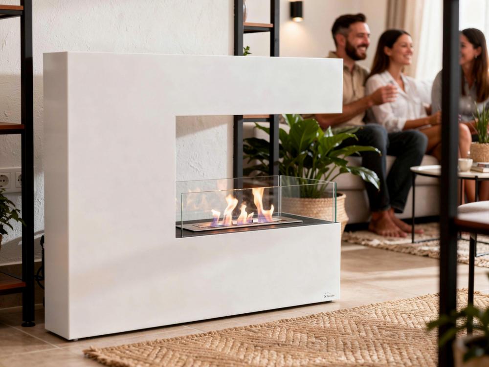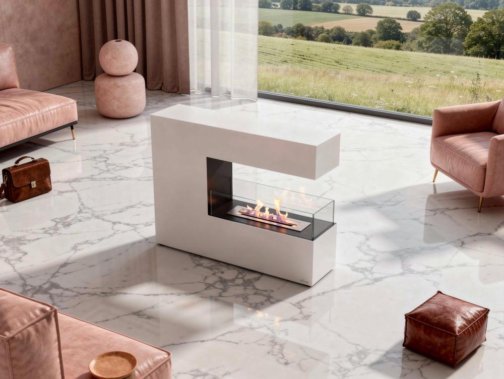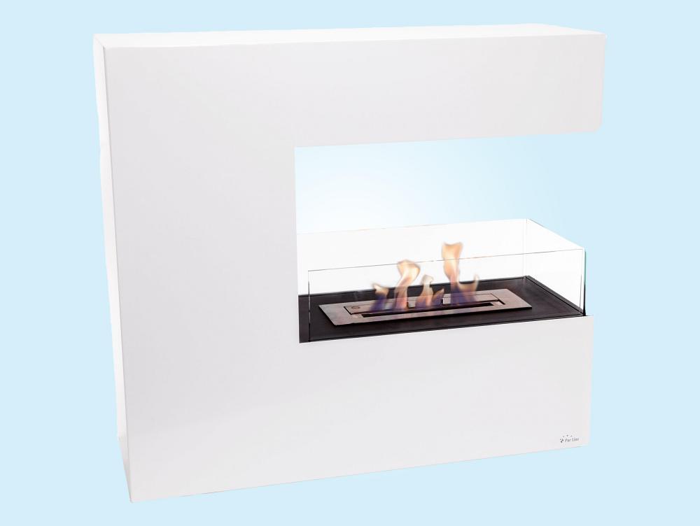 Lareira a etanol de grande formato, feita de aço lacado a branco e com três painéis de vidro temperado. Desenho em forma de C. Inclui um tanque de 2,2L e uma potência de aquecimento de 2,5KW.