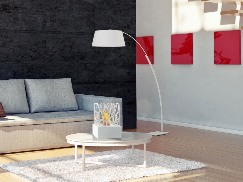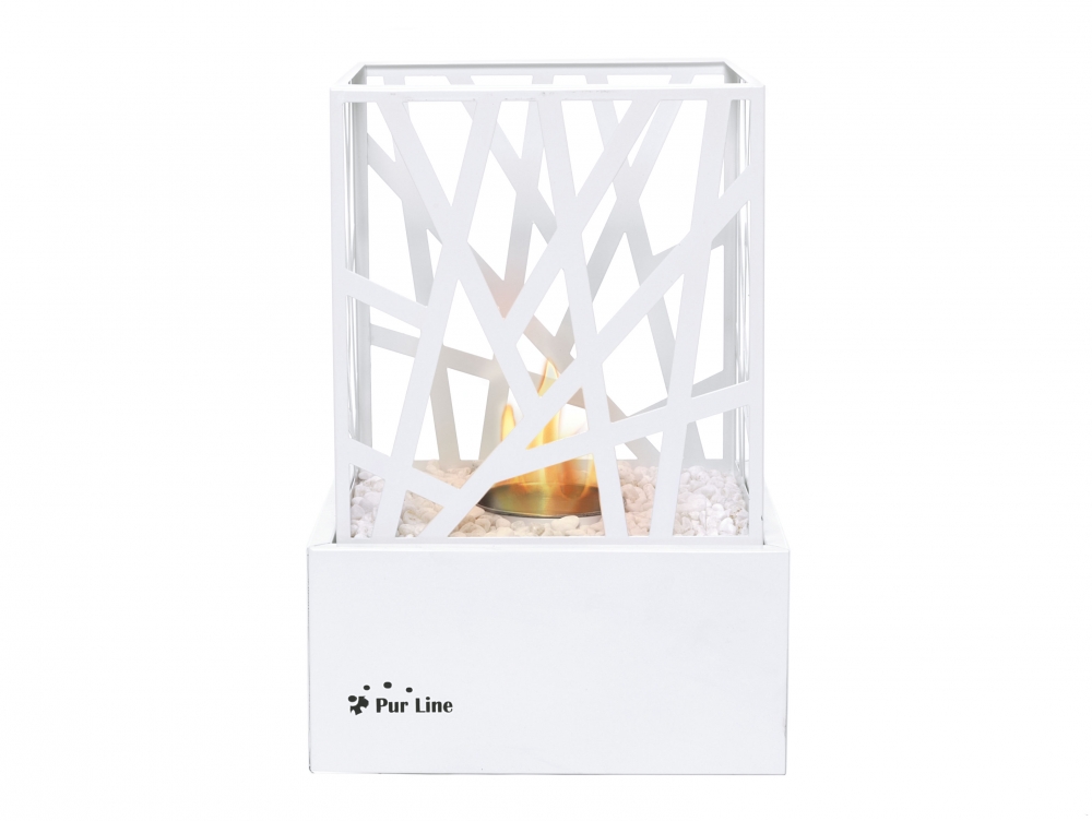 Lareira a etanol em aço esmaltado branco com um desenho genuíno que faz lembrar os ramos de uma árvore. Inclui um tanque de 0,3L e pedras decorativas no seu interior.