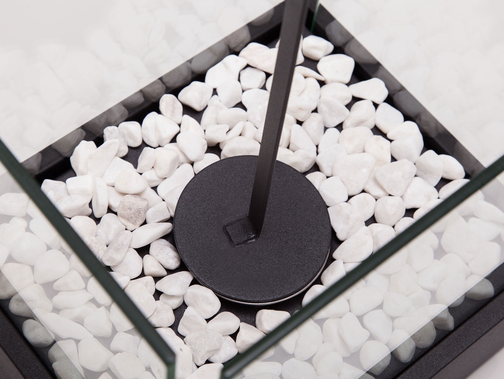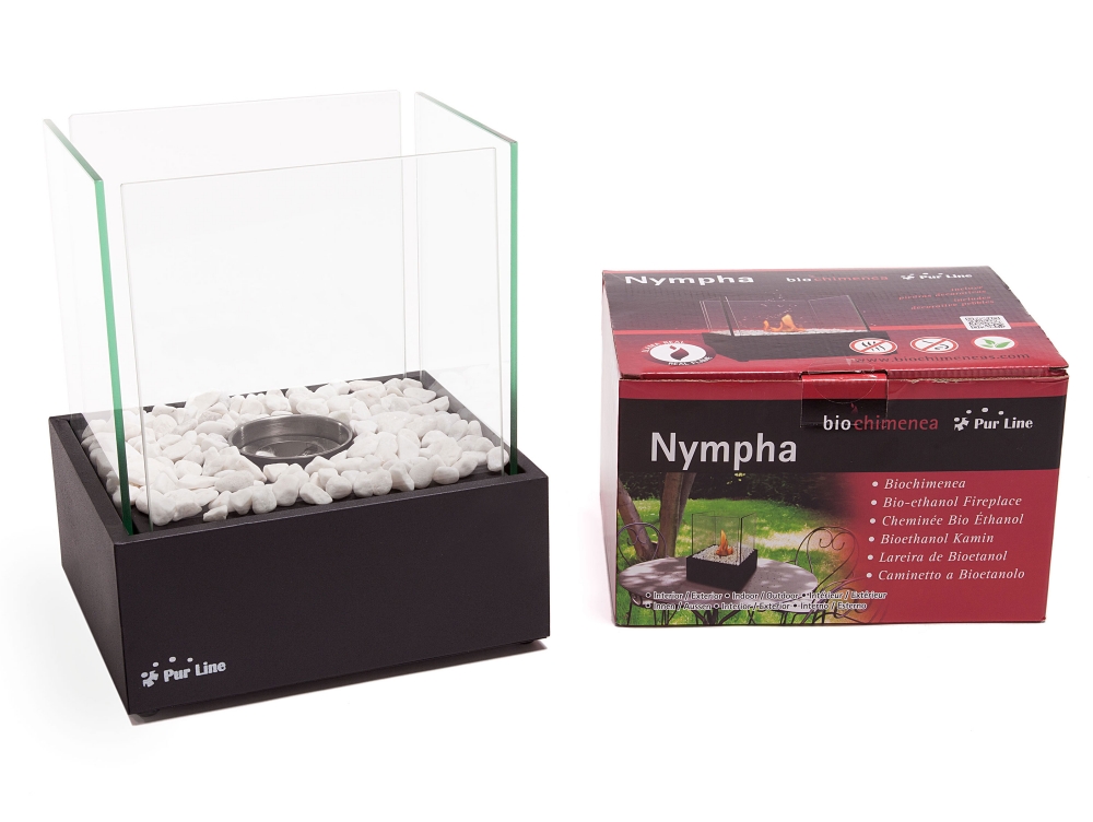 A lareira biológica NYMPHA é uma lareira minimalista e simples em preto, feita de metal e vidro temperado, com uma base de pedras decorativas e um tanque de 0,15L.