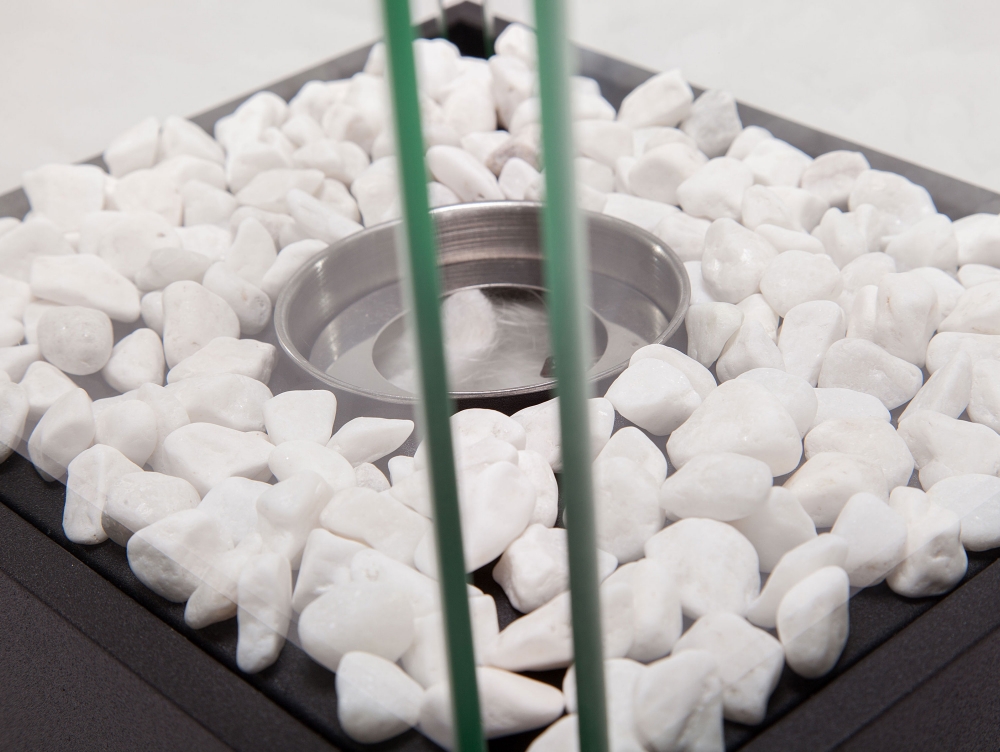 Lareira a etanol com design minimalista em cor preta. feita de metal e vidro temperado. com uma base de pedras decorativas e um tanque de 0,15L.