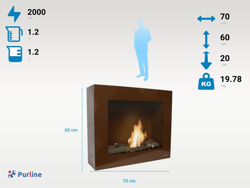 Lareira a etanol de 1,75kW e 1,2L de capacidade. Desenho rectangular em aço lacado a castanho. Inclui um kit de troncos decorativo. jarro e funil para enchimento fácil. Sem fumos, odores ou cinzas.