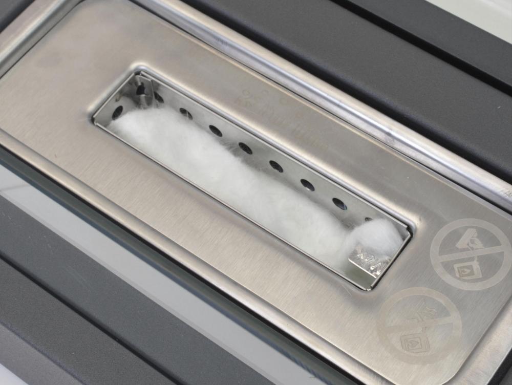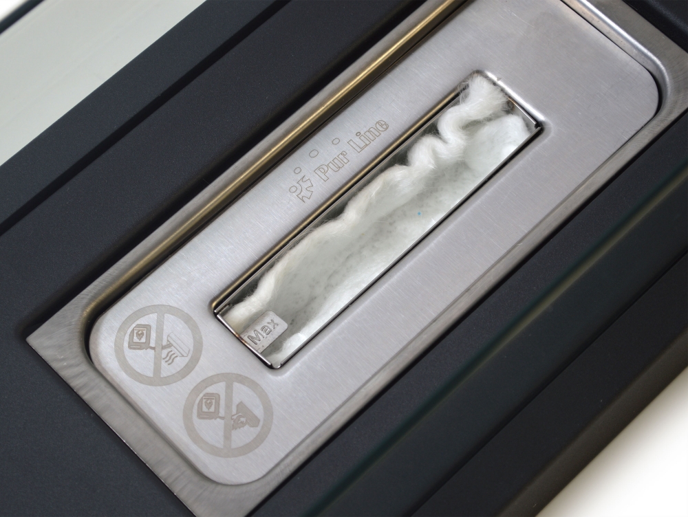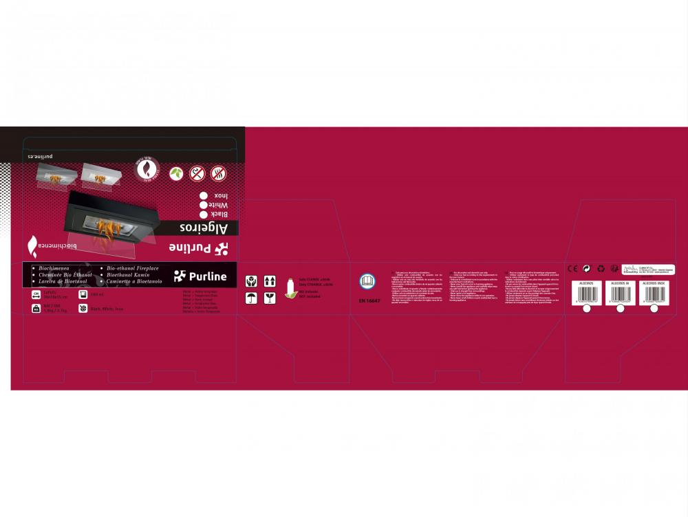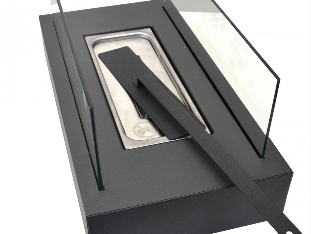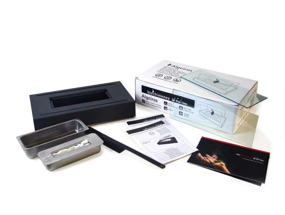 A lareira biológica ALGEIROS é um modelo retangular com uma base de aço e duas telas de vidro temperado que enquadram uma bela chama regulável.