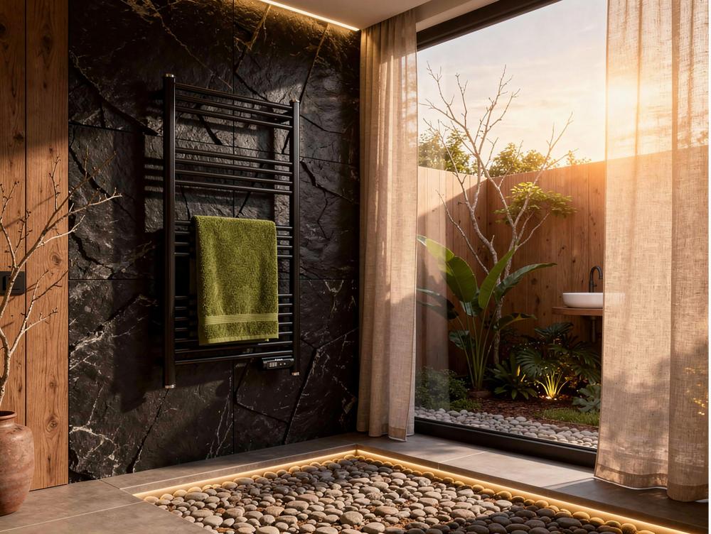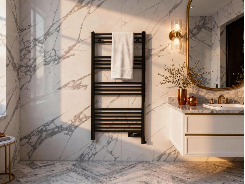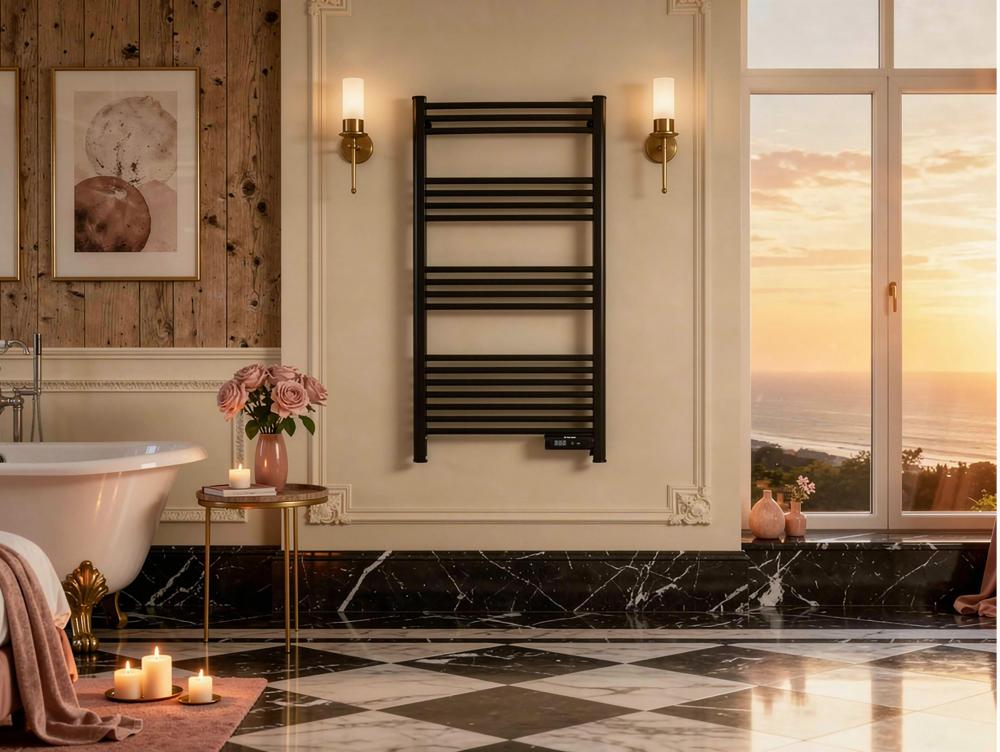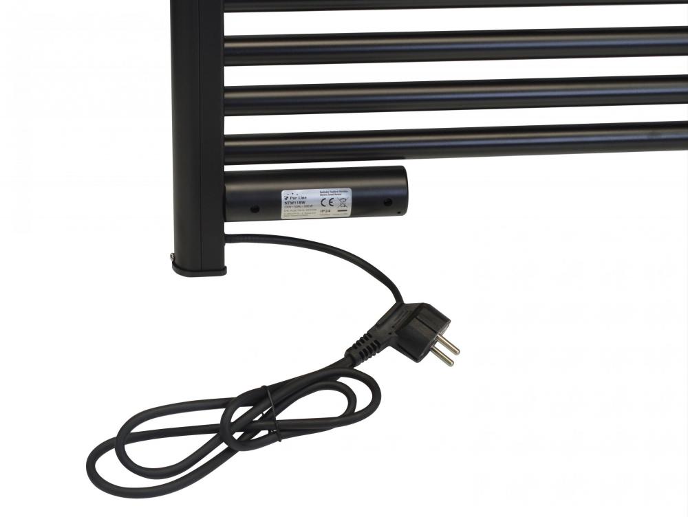 Toalheiro elétrico em alumínio de 500 W. Ecrã LED. IP24. Aquecimento rápido com função 2h. Instalação na parede. Cor preta