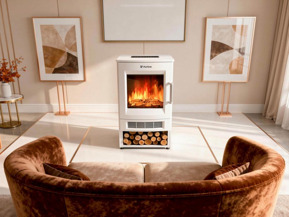 Característica em destaque: Lareira eléctrica Purline 1800W: efeito de chama LED realista, controlo remoto, termóstato, compacta, leve e sem fumo.