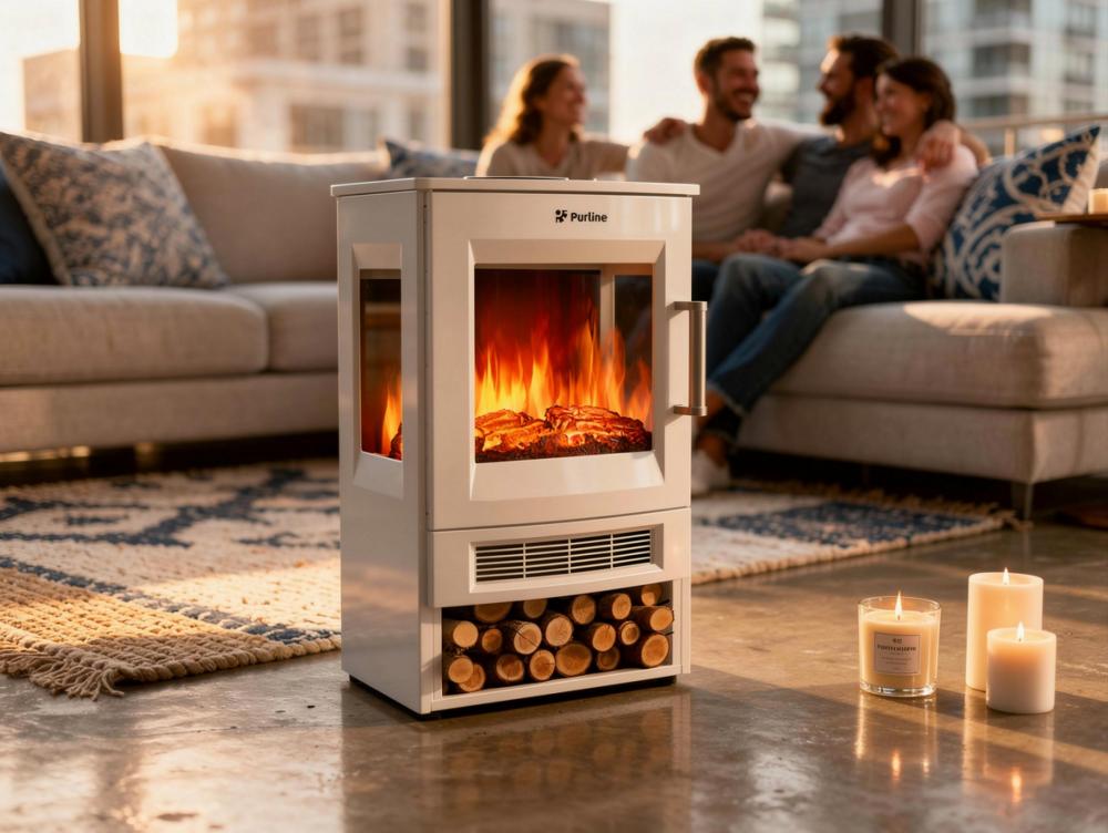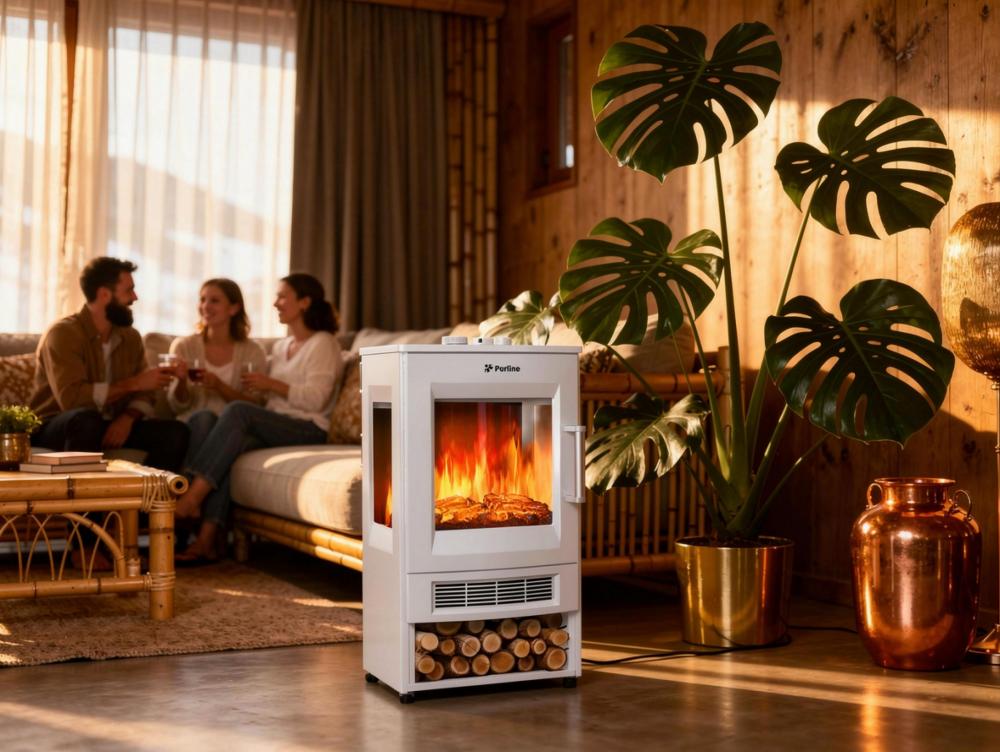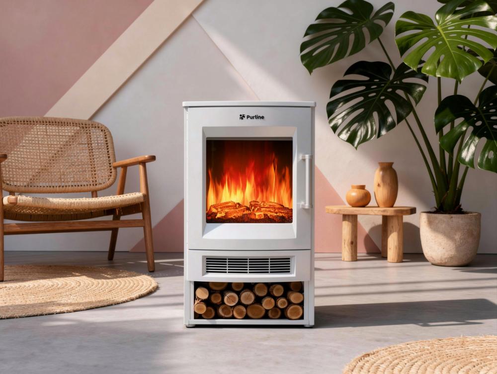 Lareira eléctrica Purline 1800W: efeito de chama LED realista, controlo remoto, termóstato, compacta, leve e sem fumo.