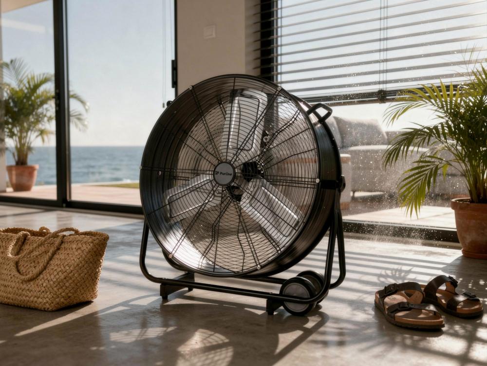 O VENTY METABLAST S possui um corpo metálico robusto e um diâmetro de lâmina de 60 cm, concebido para durabilidade e eficiência. O seu cabo de 1,7 m de comprimento facilita o posicionamento de acordo com as necessidades do espaço e está equipado com rodízios para facilitar a deslocação. Com uma base que garante uma óptima estabilidade e um motor de alta qualidade com filamento de cobre, este ventilador de chão industrial é eficiente em termos energéticos e funciona silenciosamente.