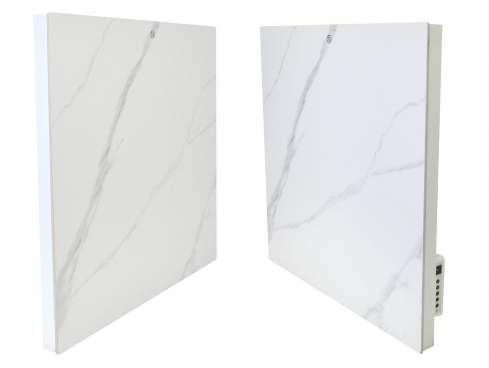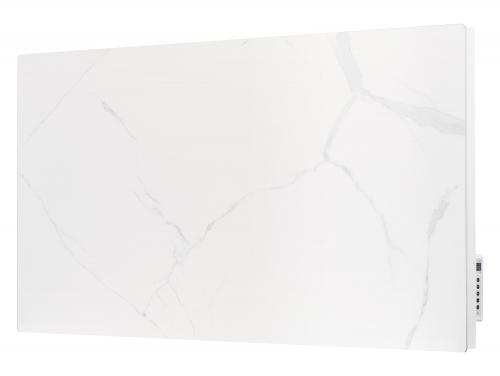 Emissor térmico com painel frontal em imitação de mármore de pedra sinterizada. Duplo sistema de emissão de calor por convecção e radiação. Inércia térmica graças à placa cerâmica frontal que acumula calor. Elemento de aquecimento em nano carbono. C
