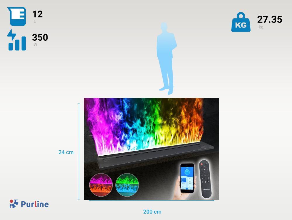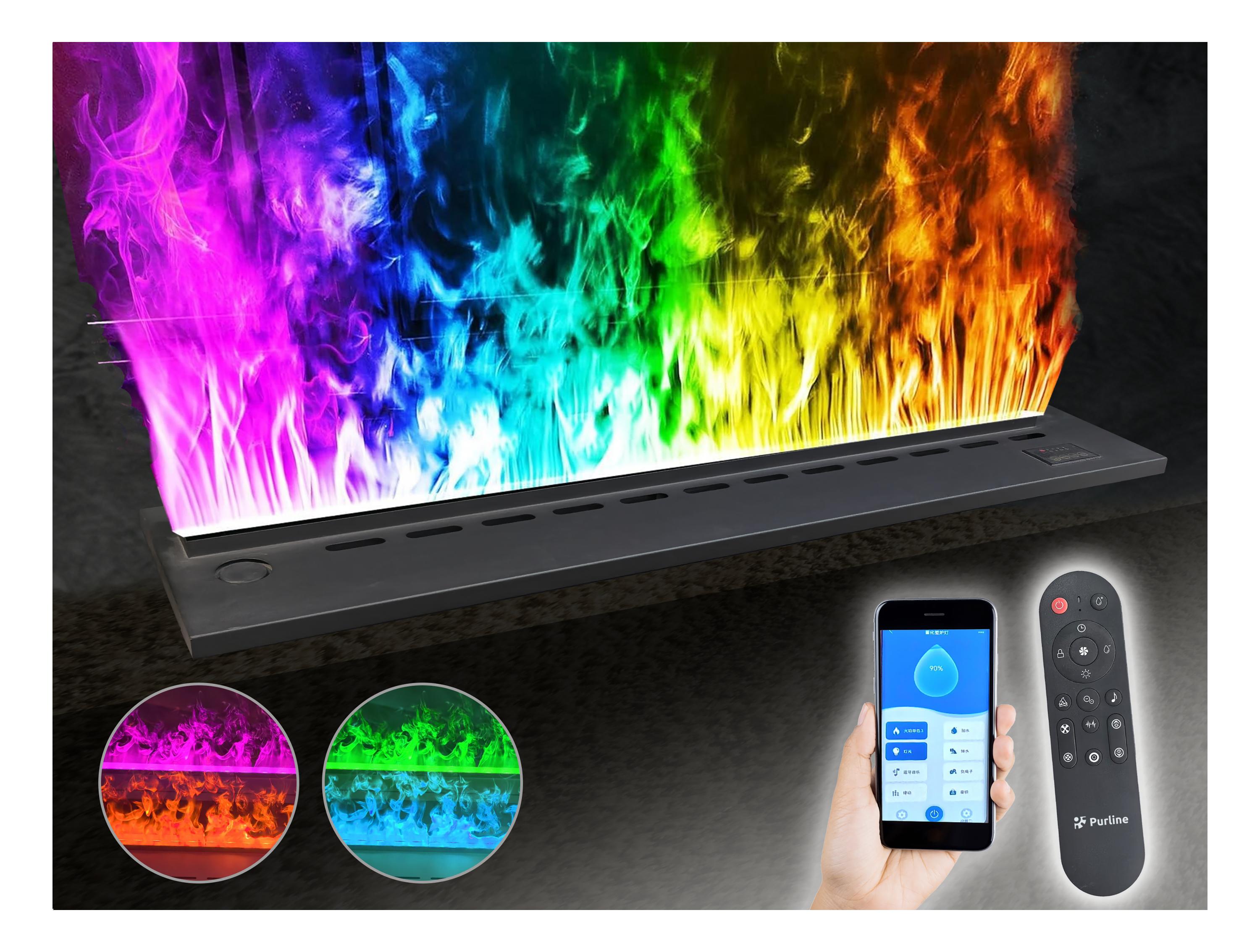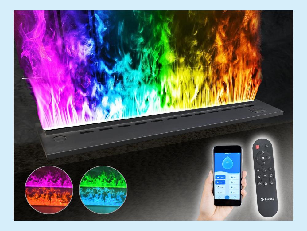 A FIRECOOL COLORS 200 é uma criação de luxo, concebida para oferecer uma experiência visual envolvente. Graças à sua tecnologia de chama simulada a vapor, gera uma chama fresca, suave e natural que imita o fogo real, sem emitir fumo ou fumos tóxicos. Além disso, o seu controlo Bluetooth através de uma aplicação no seu smartphone ou tablet, juntamente com o controlo remoto incluído, permite uma operação fácil e conveniente a partir de qualquer lugar da sala.