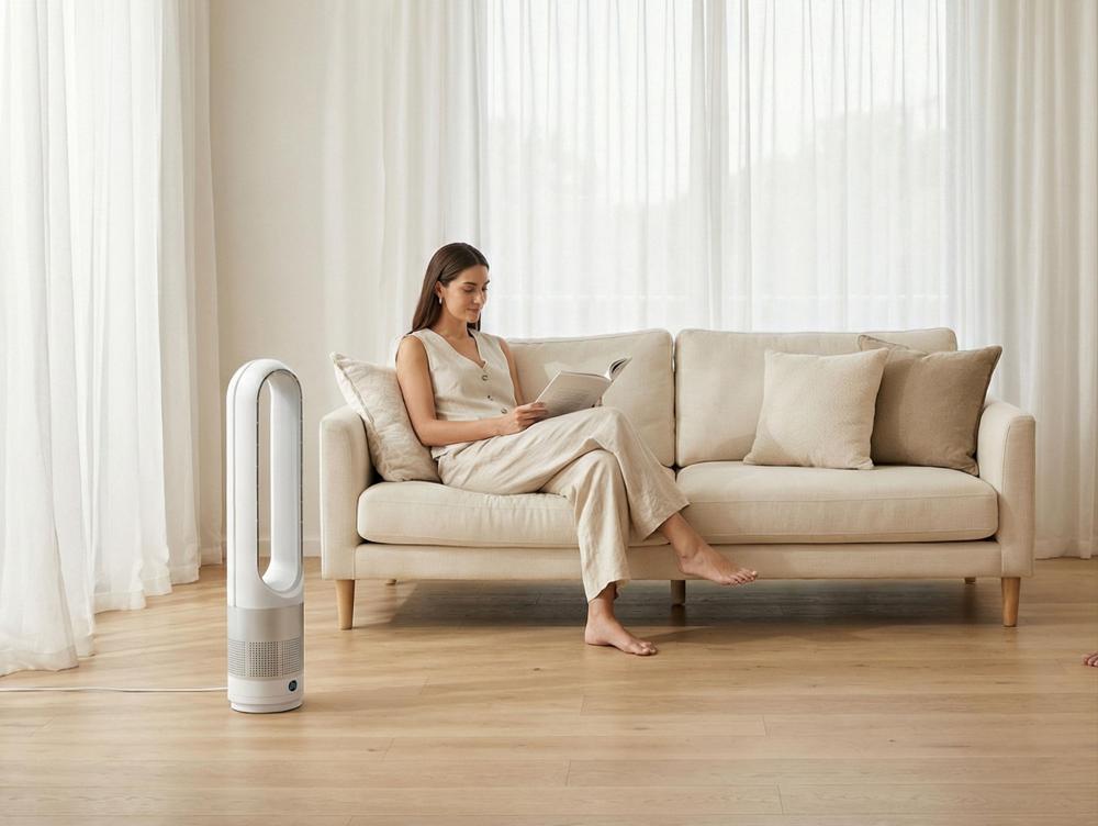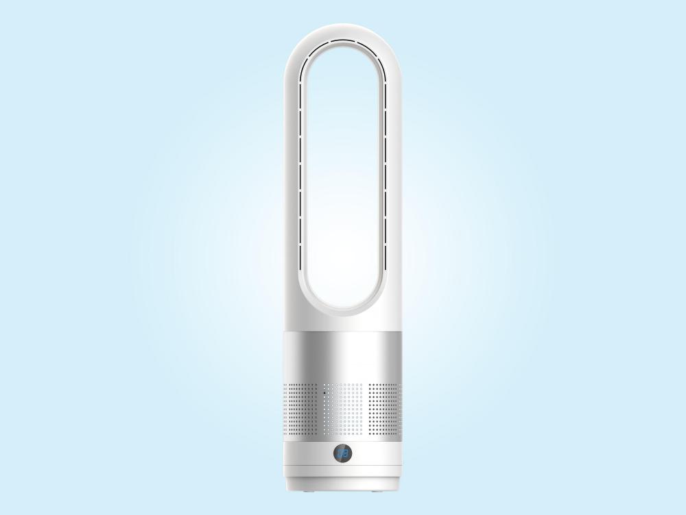 Concebida para ser segura e fácil de limpar, não tem lâminas visíveis nem elementos térmicos expostos e desliga-se automaticamente em caso de tombamento. O seu funcionamento é silencioso e ajuda a purificar o ar, sendo ideal para quartos, escritórios ou qualquer divisão da casa.