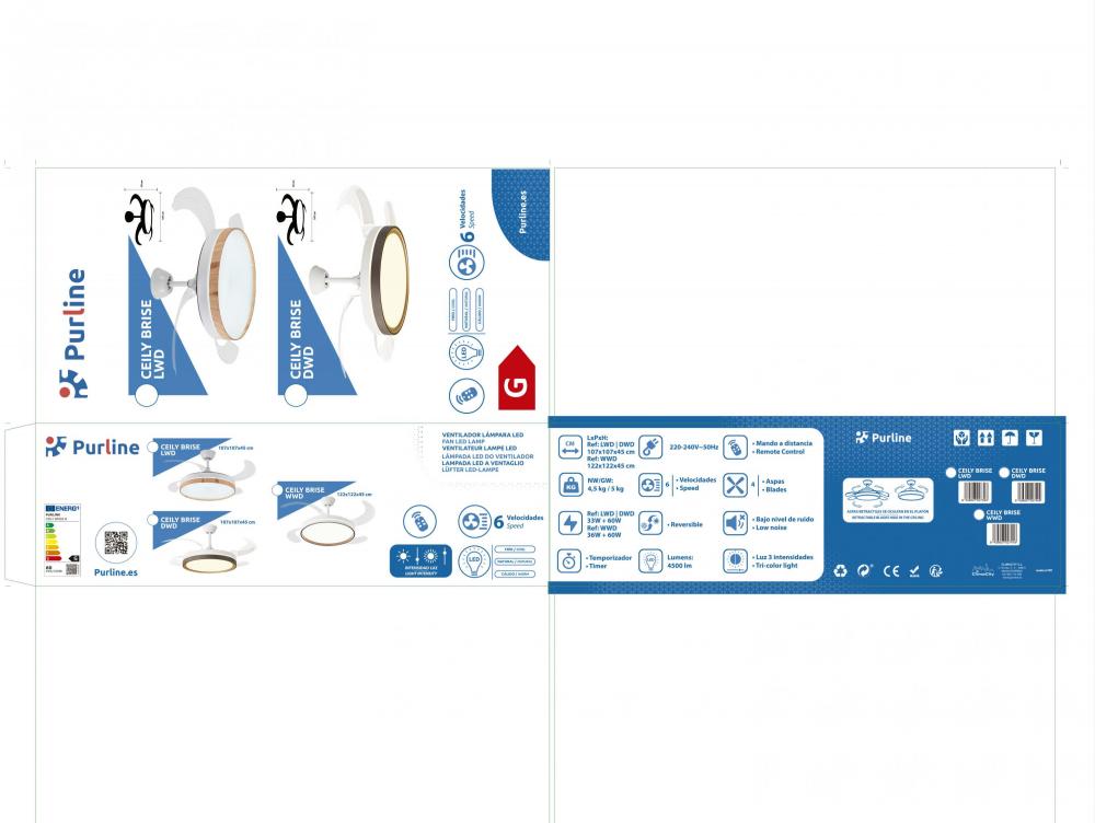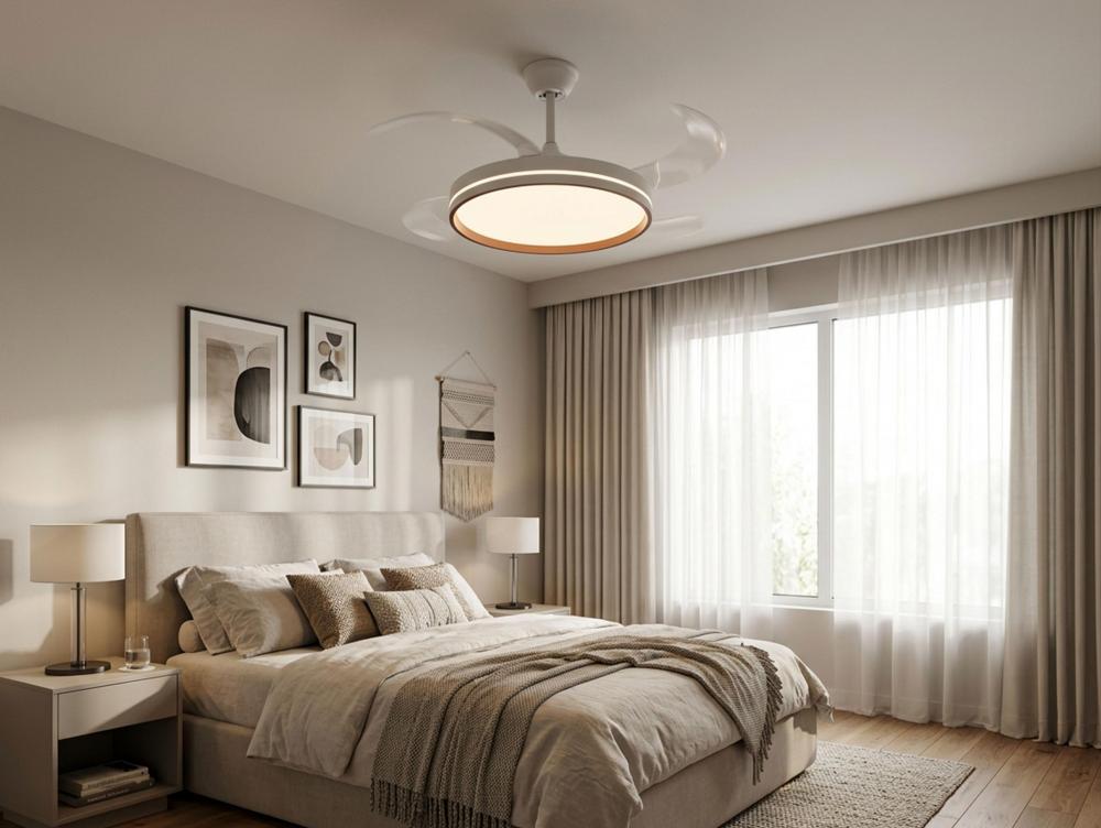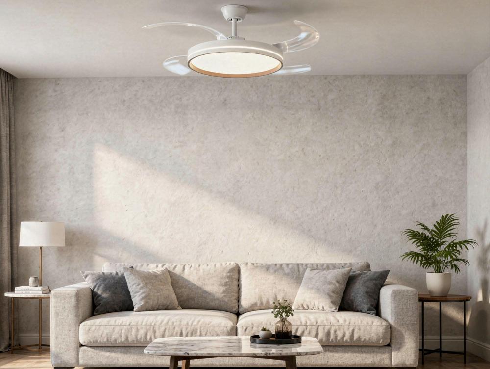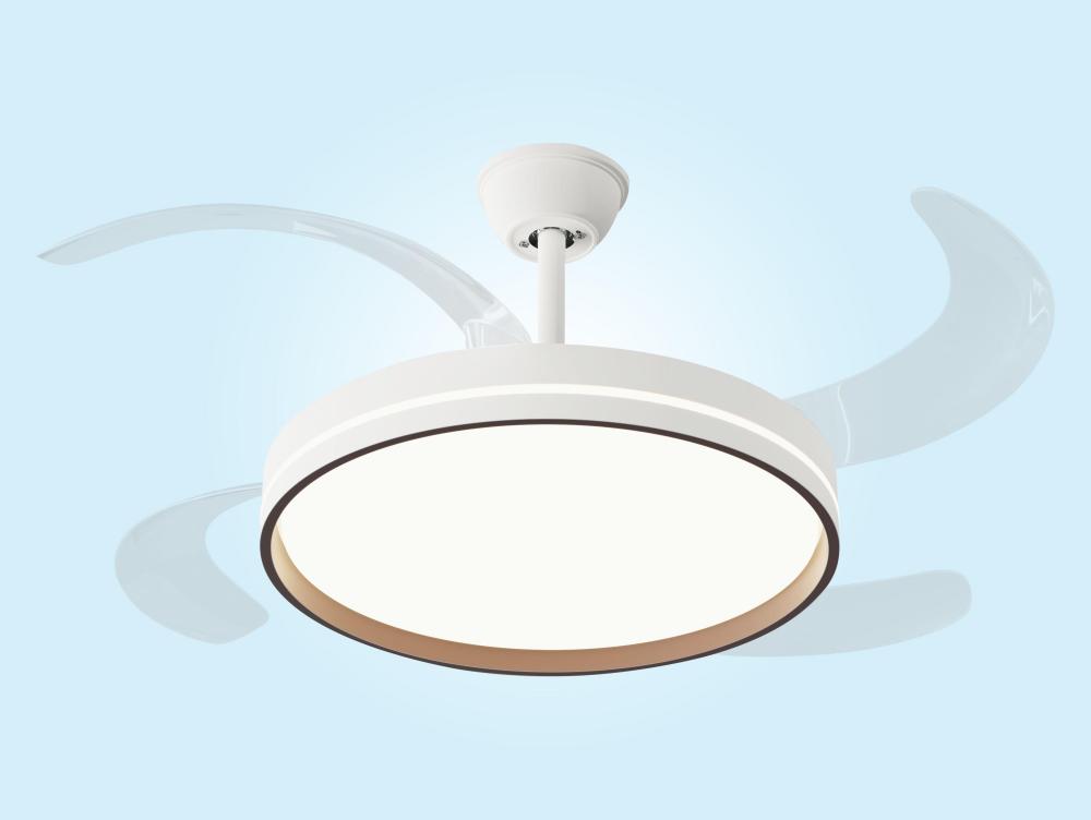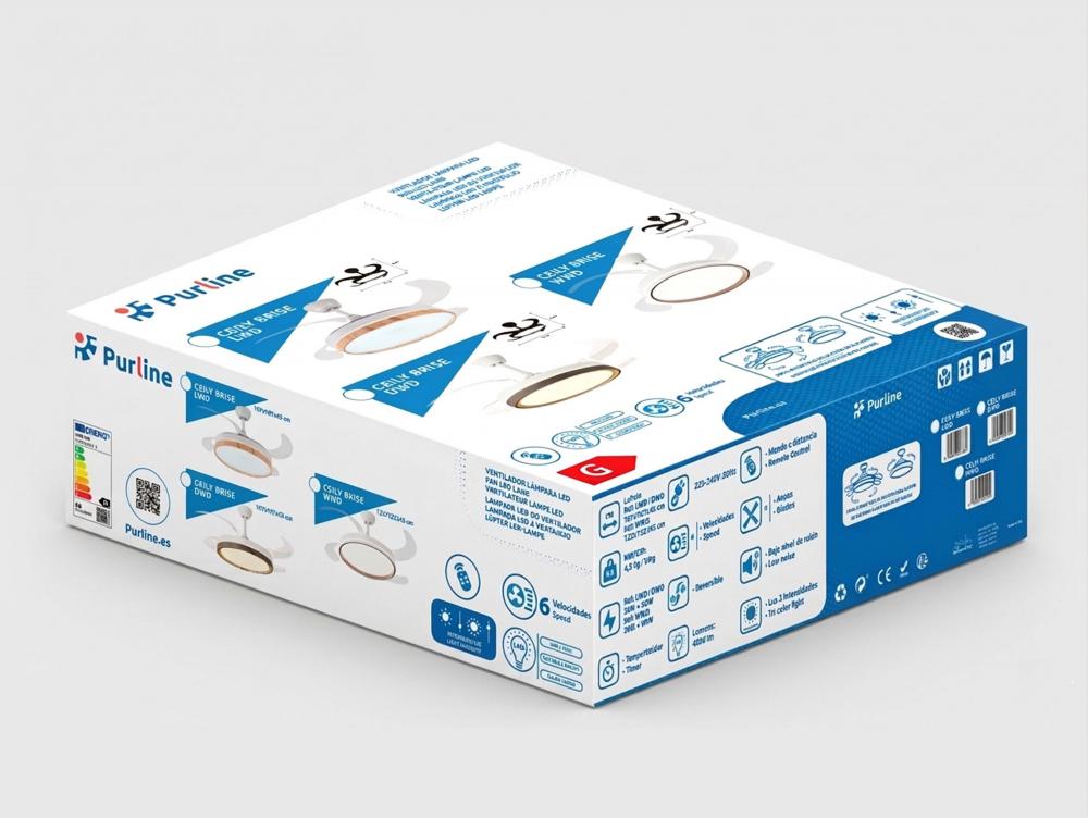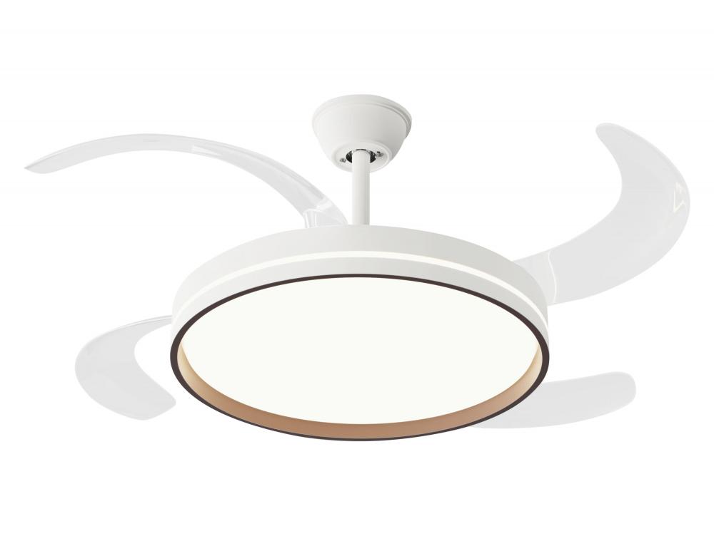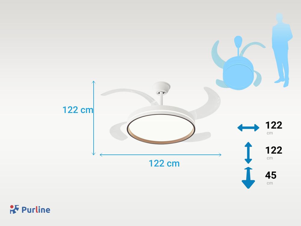 Ventilador de teto com luz retrátil. Motor DC de baixo consumo. Diâmetro com pás estendidas: 1 22 cm. 6 velocidades. Seleção de luz quente, natural ou fria. Regulação da intensidade da luz. Luminosidade máxima: 4.500 lúmenes. Sentido de rotação reversíve