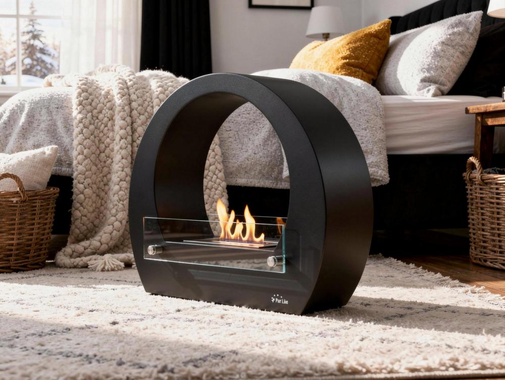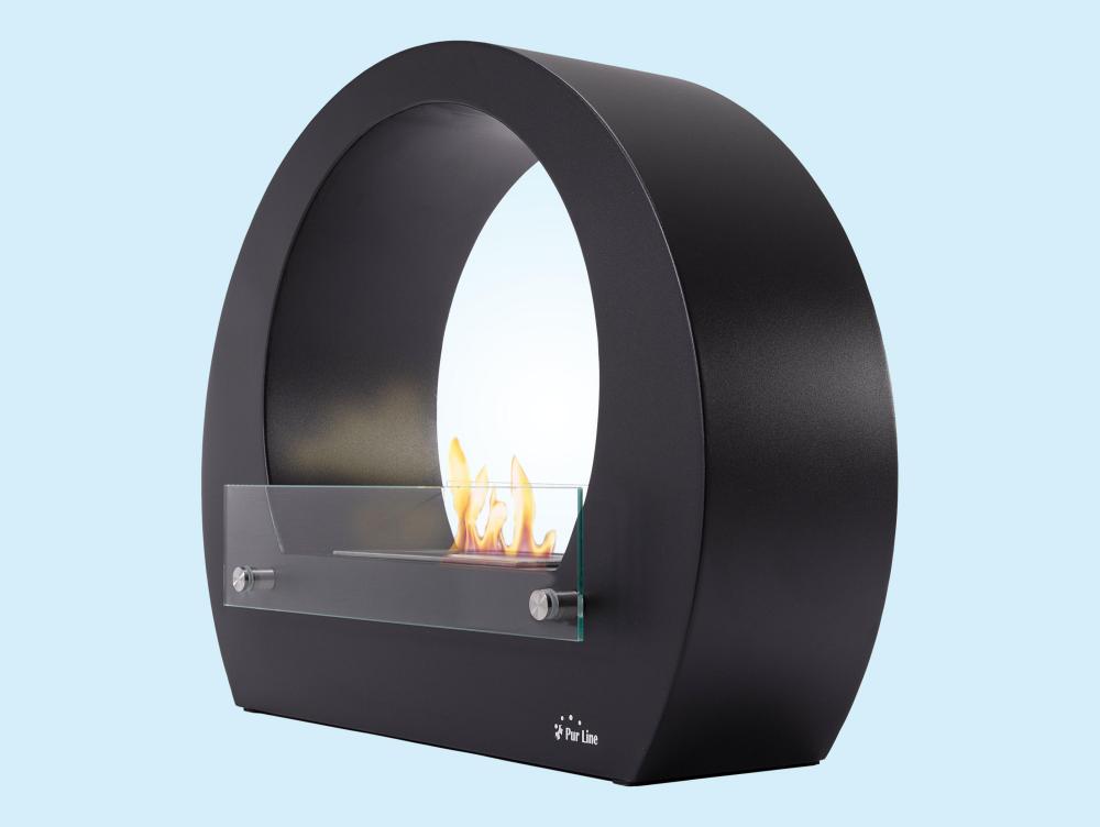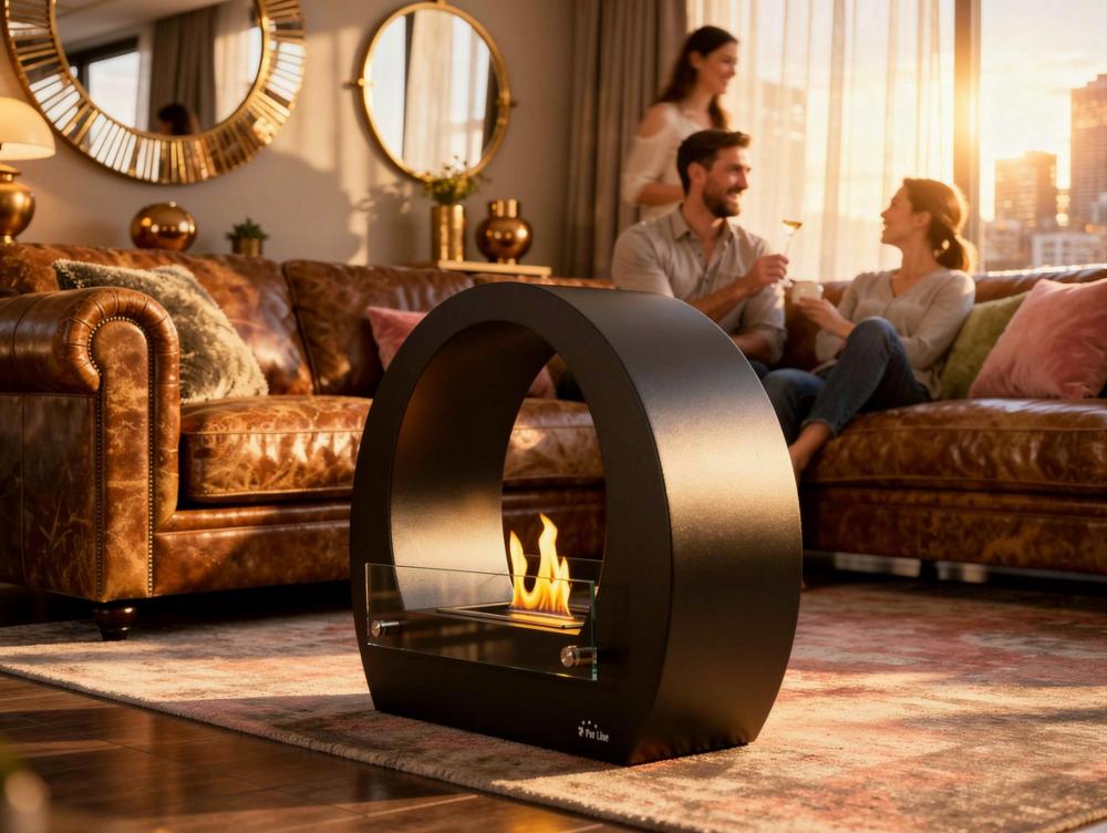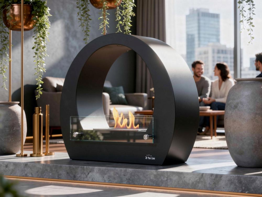 Biofireplace semicircular com vista de chama em ambos os lados