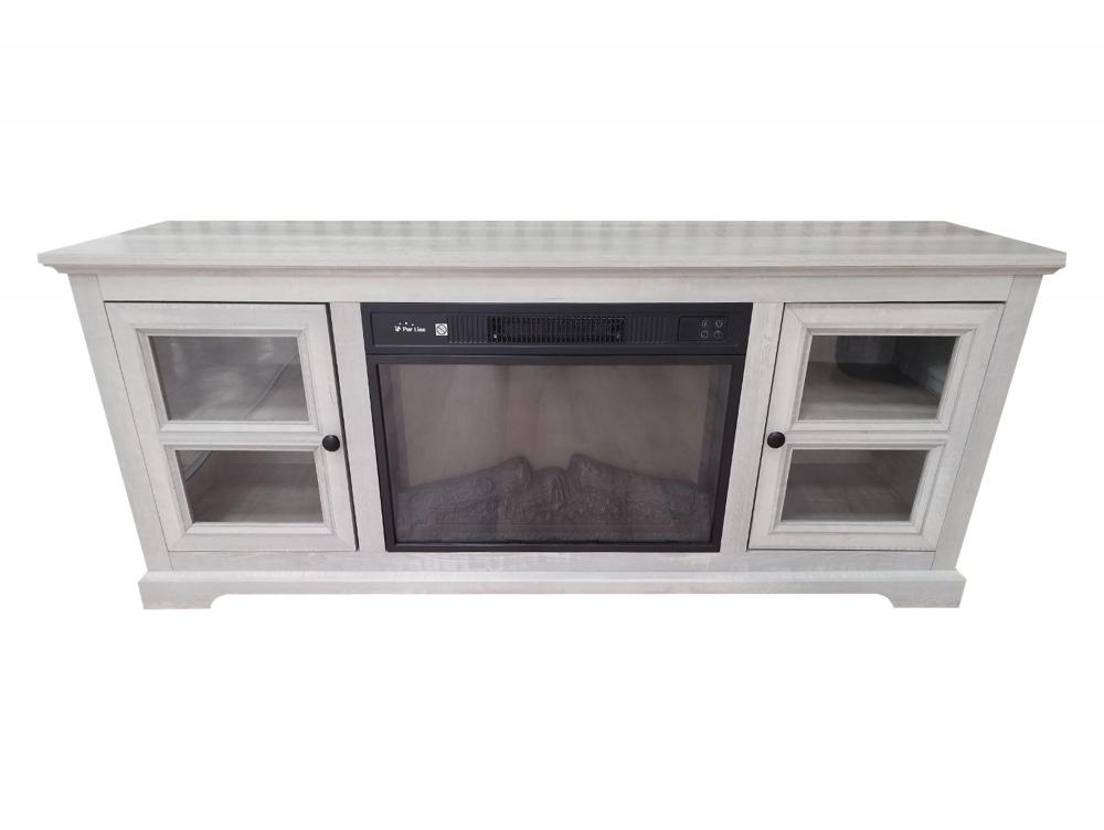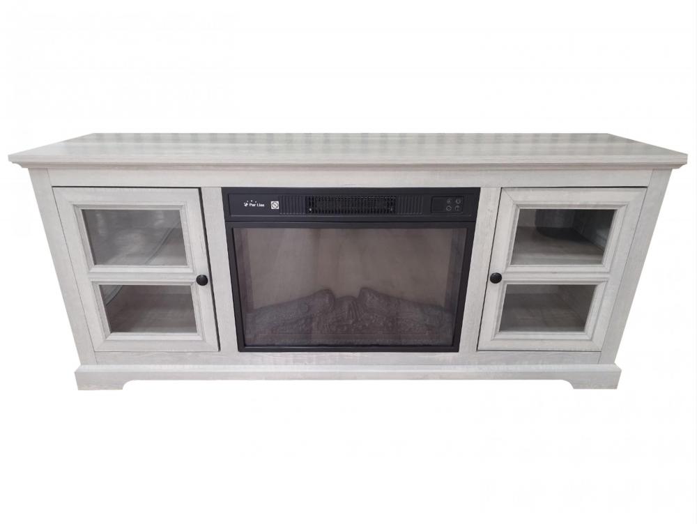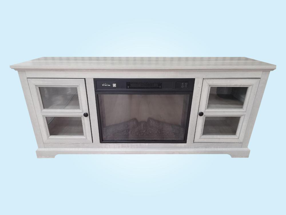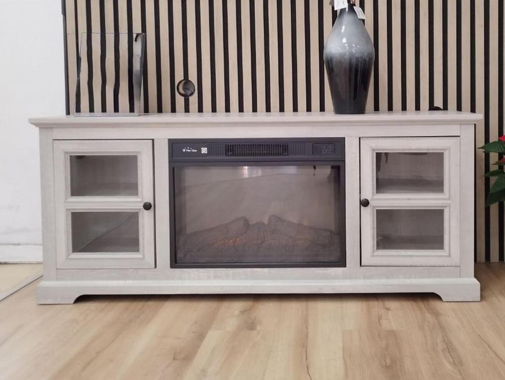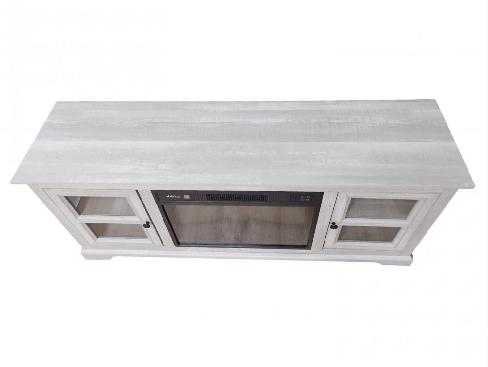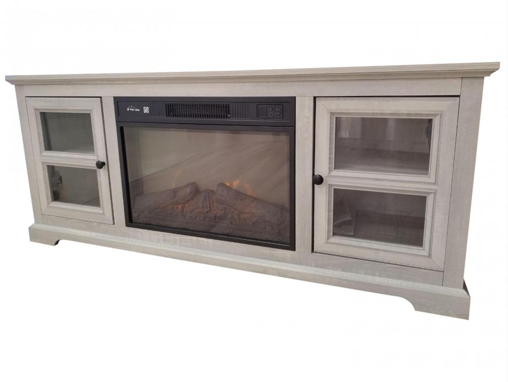 Aparador com lareira eléctrica com acabamento em carvalho cinzento. Com dois armários com porta.