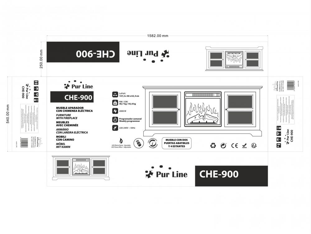 O CHE-900 é um aparador com acabamento em carvalho na cor cinza, com dois armários com portas em ambos os lados. Inclui uma lareira eléctrica com termóstato para ajustar a temperatura e regular a intensidade das chamas, bem como um temporizador para programar o desligamento automático, controlo remoto e efeito de chamas reais LED ajustável. As suas dimensões (CxPxA: 147 x 40 x 63 cm) e a sua solidez (43Kg) permitir-lhe-ão deslocar a lareira para onde mais necessitar, ajudando a criar um ambiente acolhedor e único e totalmente seguro graças à sua protecção contra sobreaquecimento.
