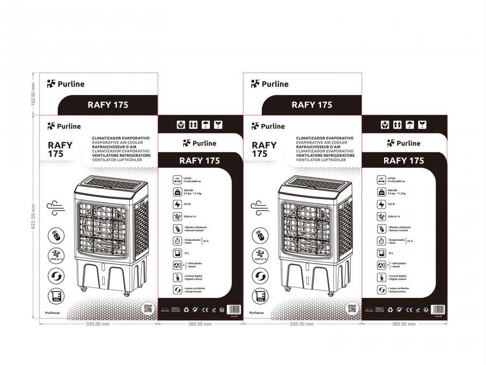 O RAFY 175 tem um temporizador (24h), tem persianas oscilantes automáticas para melhorar a distribuição do ar e oferecer uma experiência totalmente personalizada, tem também uma dupla função de humidificação e purificação do ar, tudo para um consumo máximo de 105W, tem um caudal de 3.500m3/h, dez vezes menos do que qualquer ar condicionado portátil. Entre os seus extras encontrará que tem uma abertura superior para enchimento e a possibilidade de colocar refrigeradores, tem também um painel tátil digital LED.