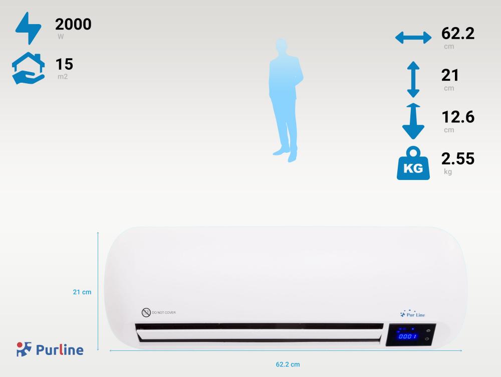 É muito fácil de utilizar, tem um painel digital LED através do qual pode escolher entre os seus 3 modos de funcionamento: ventilação, morno ou quente. Inclui também um temporizador até 8 horas e controlo remoto. Com um elegante design branco, compacto (CxPxA: 62x12,5x21 cm) e leve (4kg), é muito fácil de pendurar na parede e aquece superfícies até 12m2.