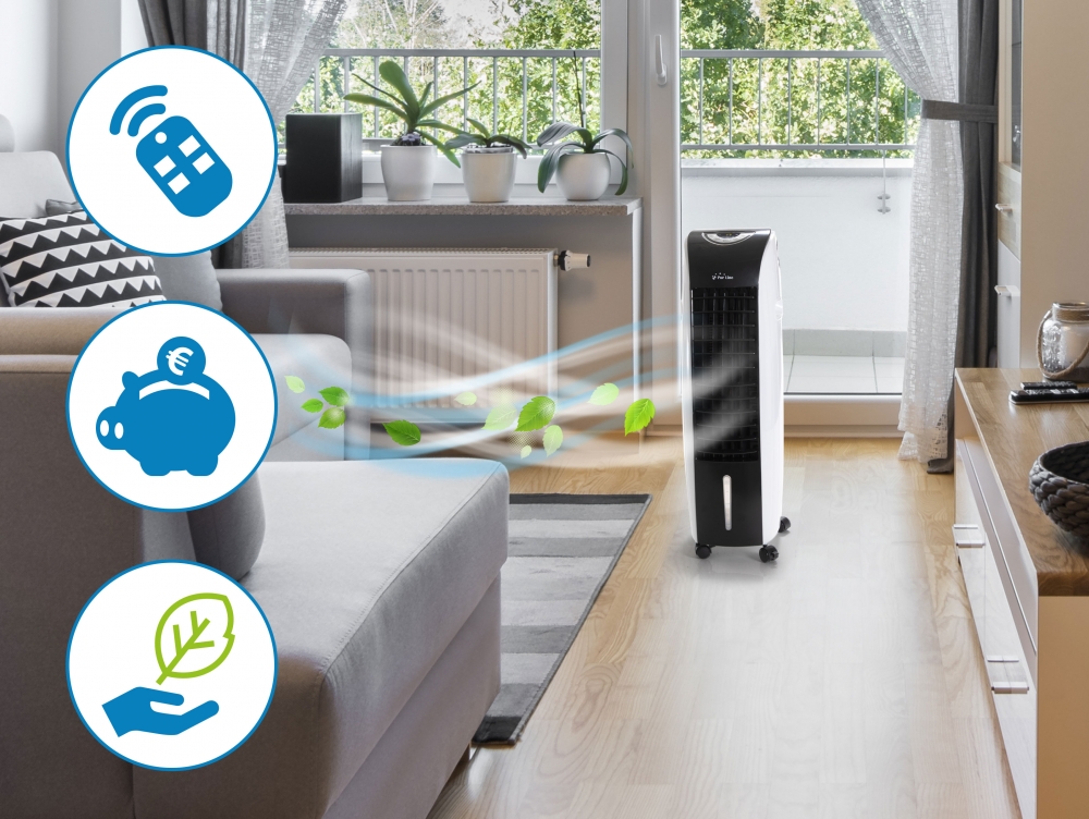 O RAFY 71 tem um painel digital com três velocidades, temporizador e oscilação automática para melhorar a distribuição do ar e oferecer uma experiência completamente personalizada, tem também uma dupla função de humidificação e purificação do ar, tudo para um consumo máximo de 70W, dez vezes inferior a qualquer aparelho portátil de ar condicionado. Entre os seus extras encontrará a possibilidade de controlo remoto através de controlo remoto.