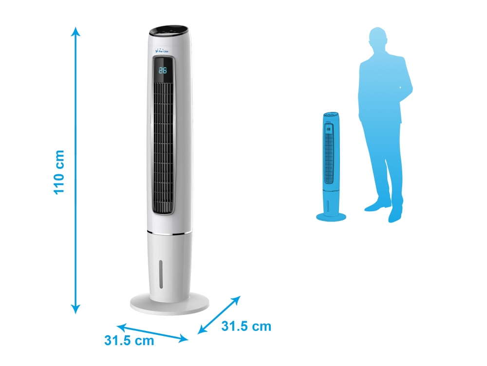Com um desenho compacto de torre, acabamento branco e detalhes em preto, as suas dimensões (CxLxA: 31,5 x 31,5 x 110 cm) e peso (5,3kg) tornam-no ideal para divisões até 15m2.