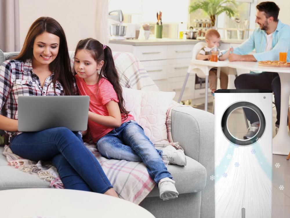 Com um design compacto com acabamento em branco com detalhes em preto, o seu tamanho (LxDxH: 19 x 26 x 63 cm) e peso (5,5kg) tornam-no ideal para salas até 15m2.