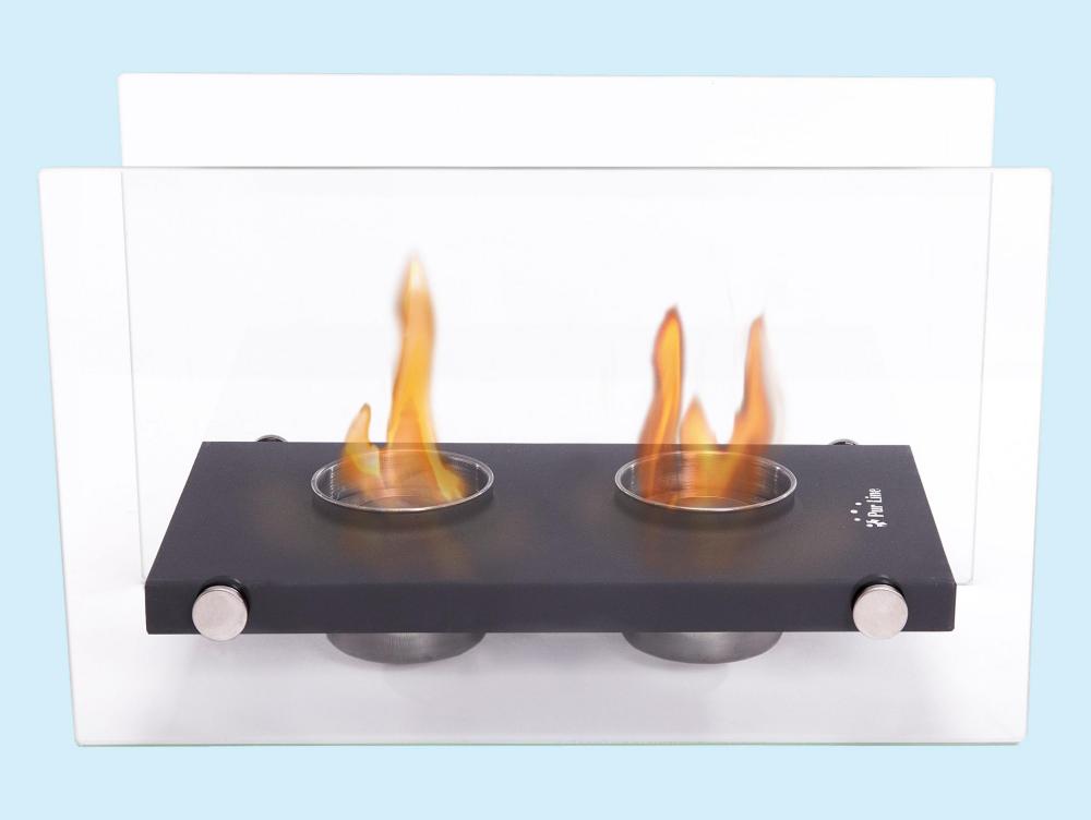 Característica em destaque: Lareira de chama dupla feita de metal e vidro temperado de cor preta e com 2 pequenos tanques de 0,15L que geram uma chama dupla.