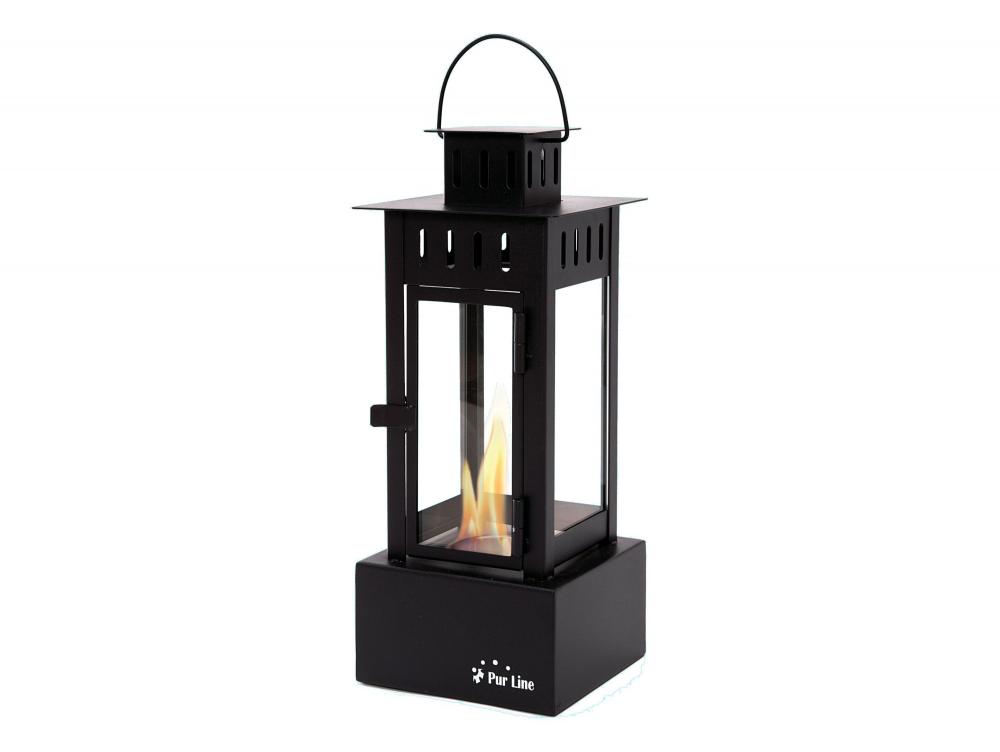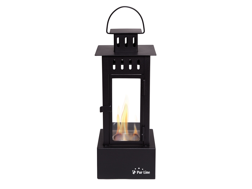 Lareira a etanol com design de lanterna. Feita de metal com acabamento em preto, tem um tanque de 0,5L. As suas quatro placas de vidro temperado contêm chamas que darão um toque diferente e criativo à sua casa.