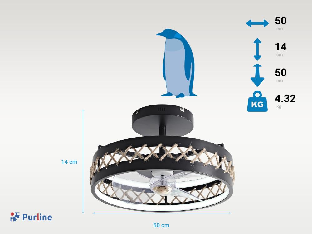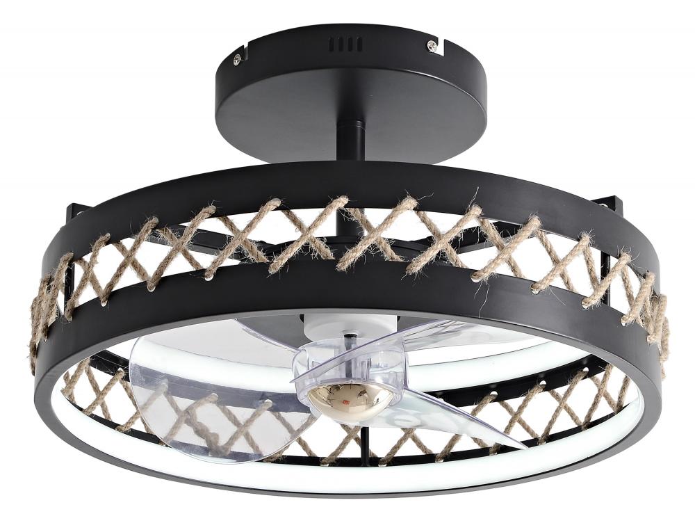 Candeeiro LED para ventoinha de teto com detalhes de acabamento em corda. Controlado por telecomando ou através de App via Bluetooth. Três tipos de luz LED: Fria. Natural ou Quente. Níveis de intensidade luminosa graduados Luz: 52W. Ventoinha: 13W Tempori