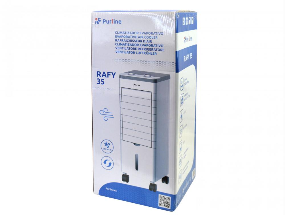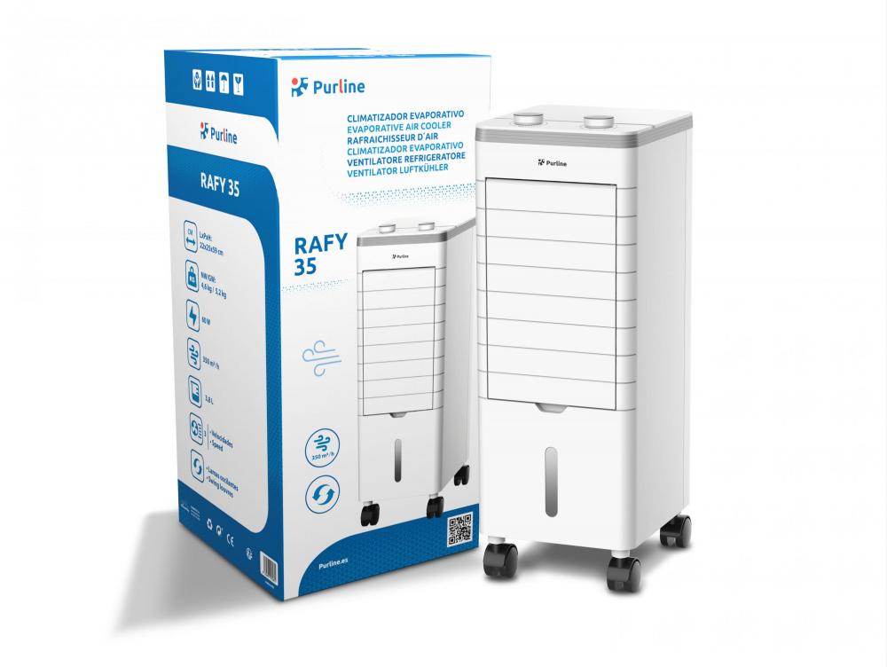 O RAFY 35 tem um painel digital com três velocidades e 3 modos alternativos, temporizador e oscilação automática para melhorar a distribuição do ar e oferecer uma experiência totalmente personalizada, tem também uma dupla função de humidificação e purificação do ar, tudo para um consumo máximo de 60W, tem um caudal de 350m3/h, dez vezes menos do que qualquer ar condicionado portátil.
