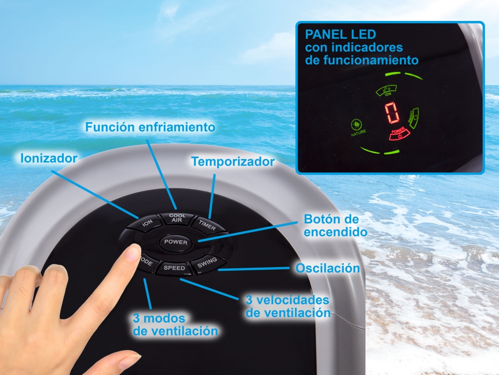 O RAFY 81 tem um painel digital com três velocidades, dois ritmos alternativos, temporizador e oscilação automática para melhorar a distribuição do ar e oferecer uma experiência completamente personalizada, tem também uma dupla função de humidificação e purificação do ar graças ao seu ventilador, tudo isto para um consumo máximo de 70W, dez vezes inferior a qualquer aparelho portátil de ar condicionado. Entre os seus extras encontrará a possibilidade de controlo remoto através de controlo remoto.