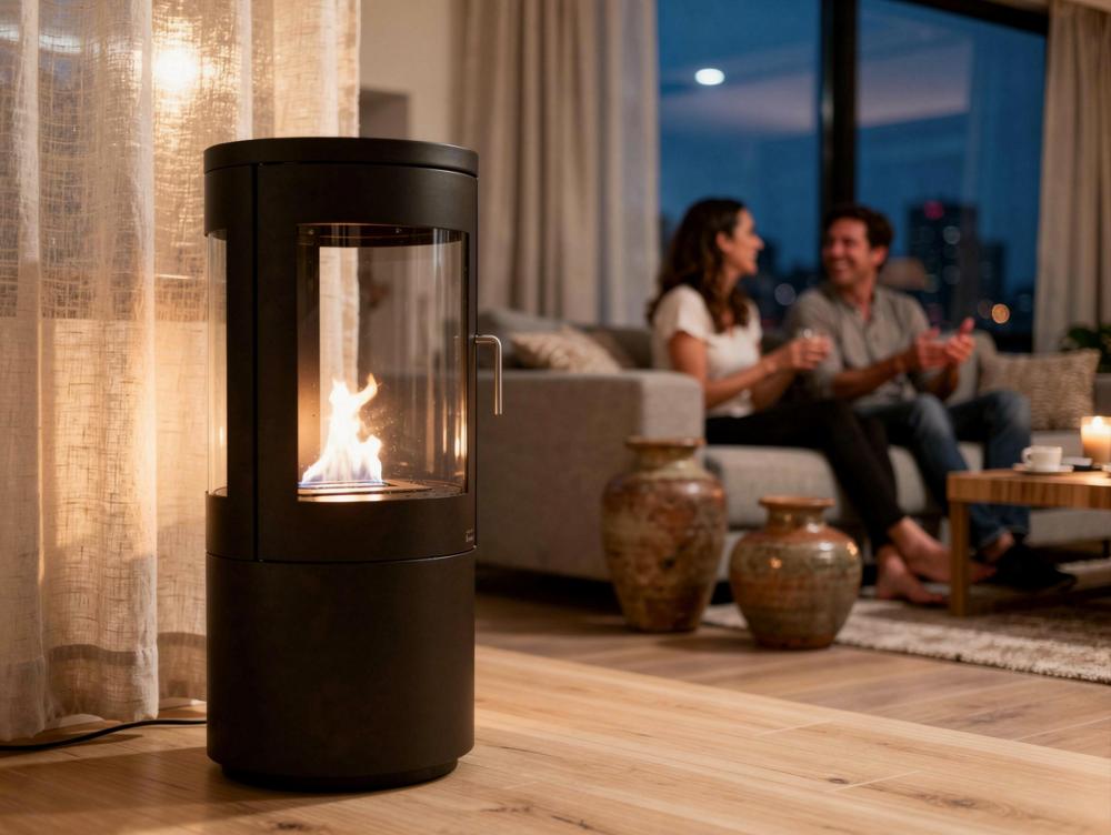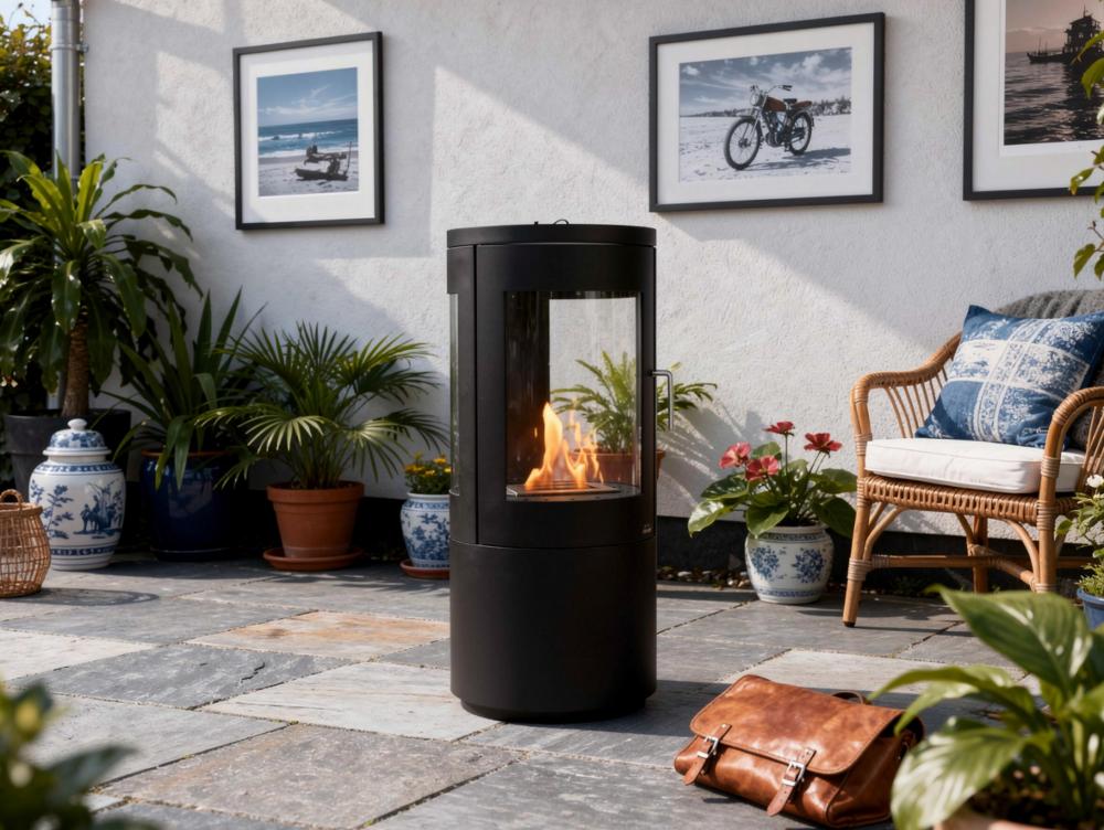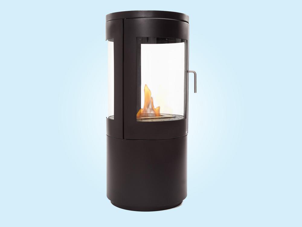 Fogão a etanol de design em torre em aço preto com porta de vidro temperado