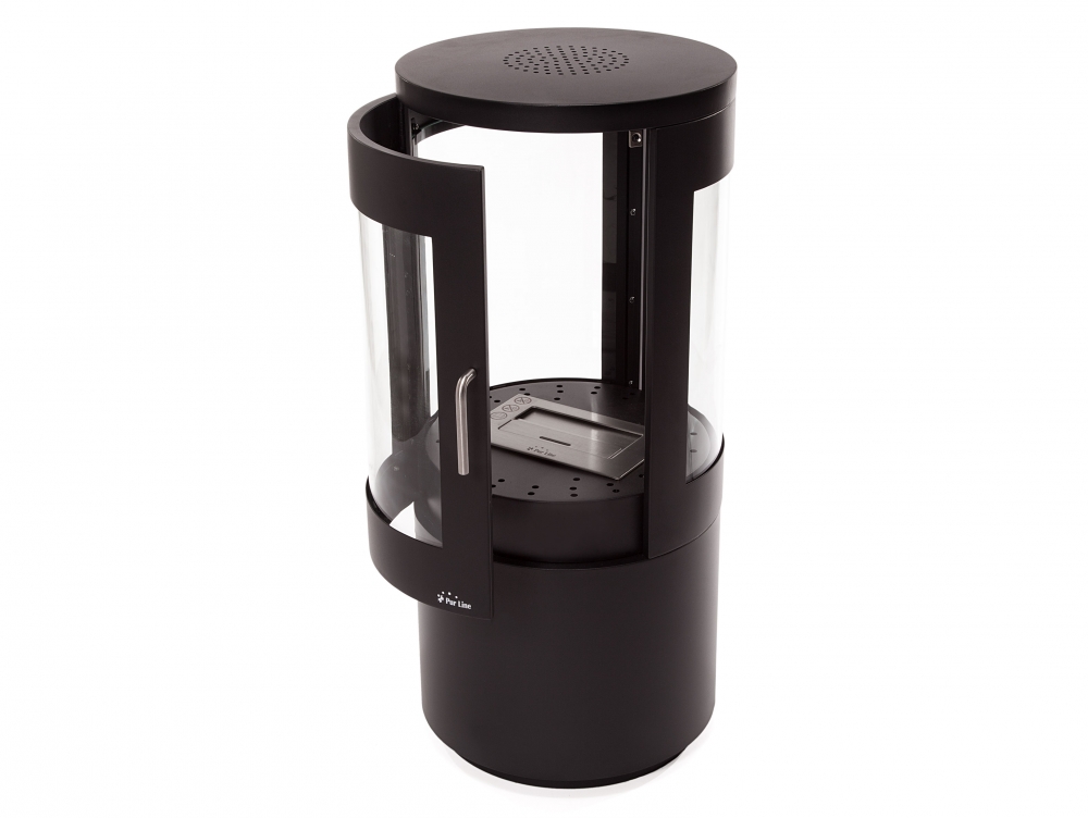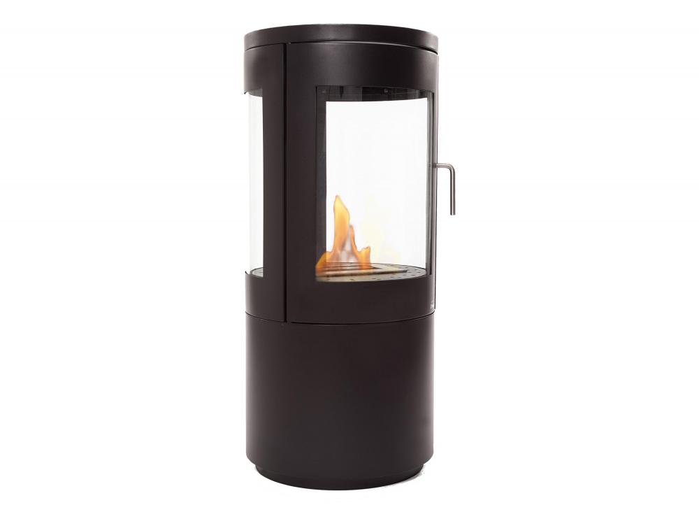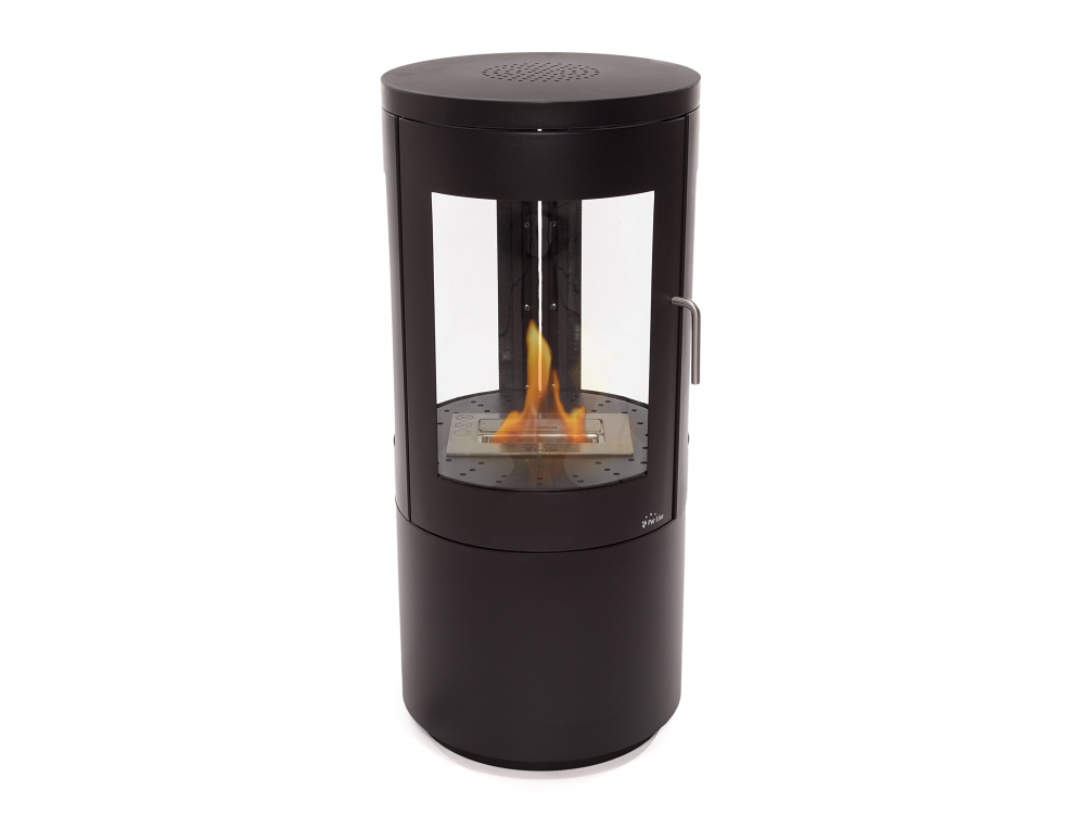 Panela circular de bioetanol com três painéis de vidro com visão de 360°.