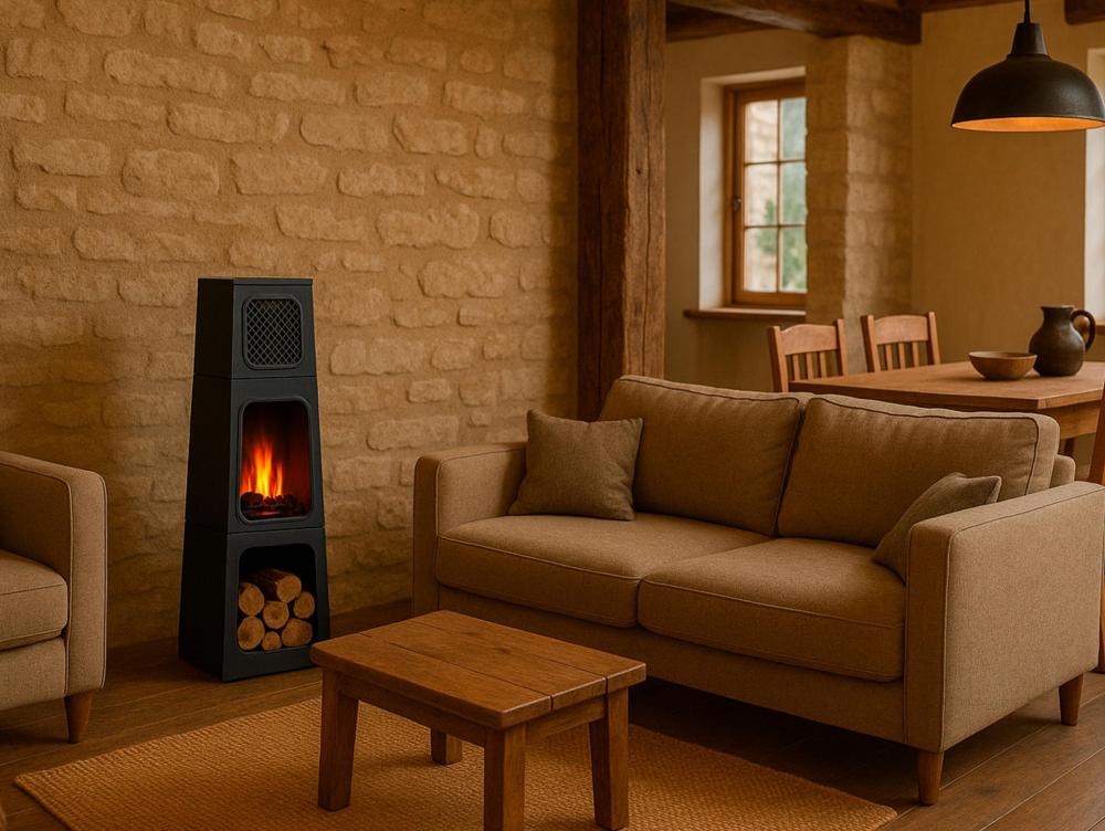 Feito de materiais duráveis e de alta qualidade, este fogão não só proporciona calor visual, mas também funcionalidade. Com um peso de 16,6 kg, a sua estrutura robusta mas compacta adapta-se facilmente a diferentes tipos de ambientes interiores. Além disso, inclui um espaço inferior para madeira decorativa, realçando o aspeto clássico e caseiro do conjunto.