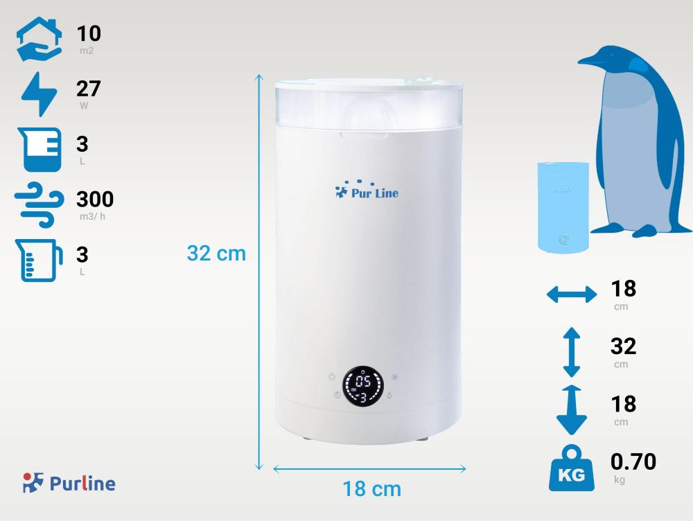 O humidificador HYDRO 9 caracteriza-se pelo seu funcionamento ultra-sónico digital. O seu tamanho (C x P x A): 18 x 18 x 18 x 18 x 32 cm), leveza (1,3 kg) e tanque (3 L) tornam-no ideal para salas pequenas.