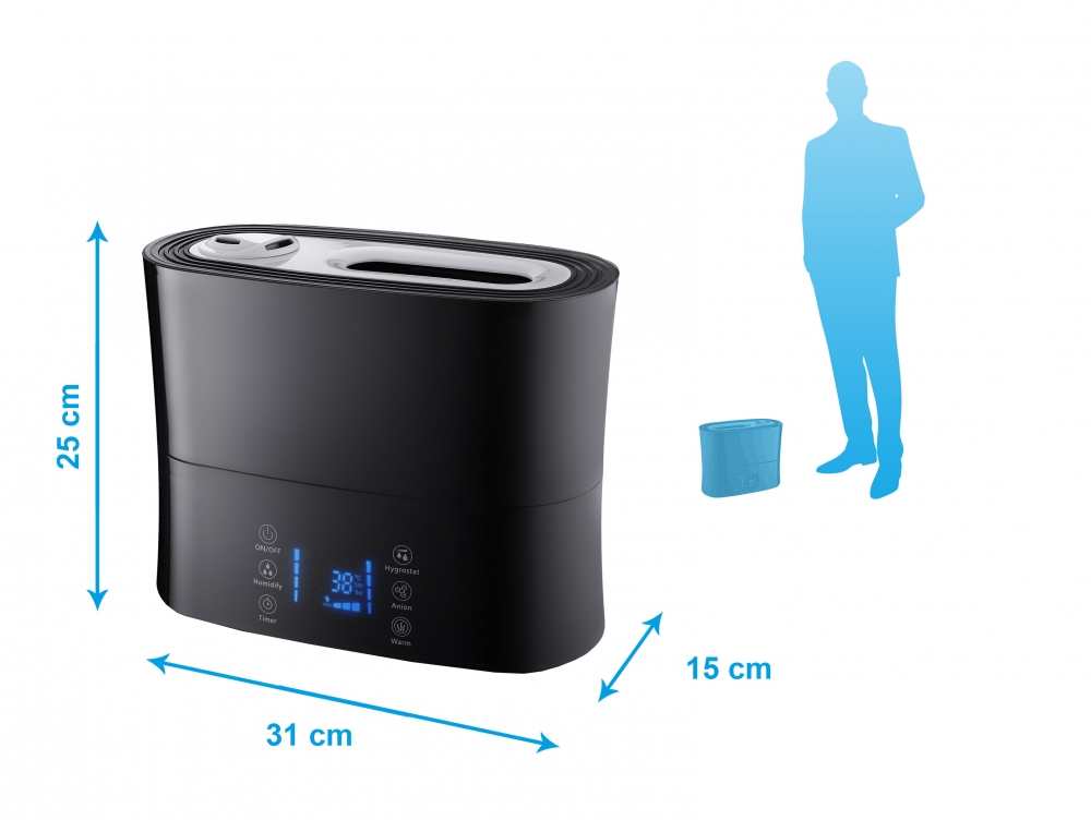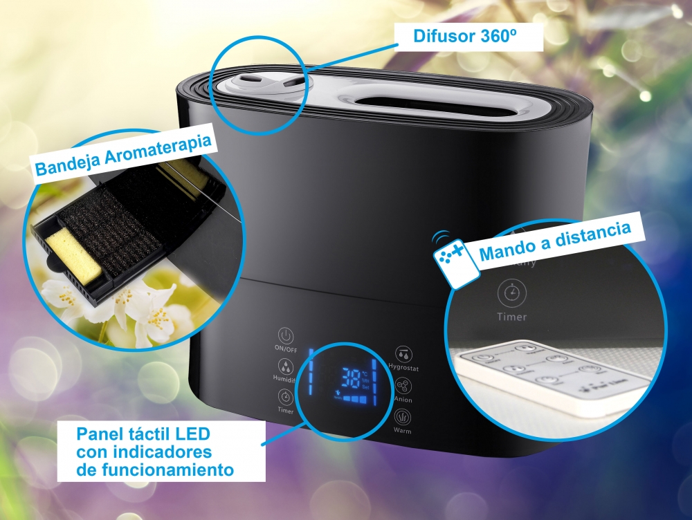 Esta concepção em forma de rectângulo preto tem um painel de controlo táctil com visor digital e brilho ajustável, indicador de temperatura, bandeja para aromas e possibilidade de controlo remoto através de controlo remoto. As suas dimensões (C x P x A): 31 x 15 x 15 x 24 cm), leveza (2 kg) e capacidade do tanque (4L) tornam-no ideal para salas até 33m2.
