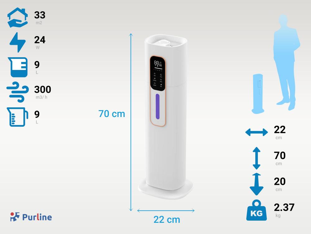 Seu moderno design de torre em branco dispõe de um painel de comandos tátil com display digital e controle à distância. Você pode facilmente preenchê-lo no topo. Seu tamanho (LxPxH): 22x22x70 cm), leveza e depósito (9L) o tornam ideal para estadias de até 33m2.