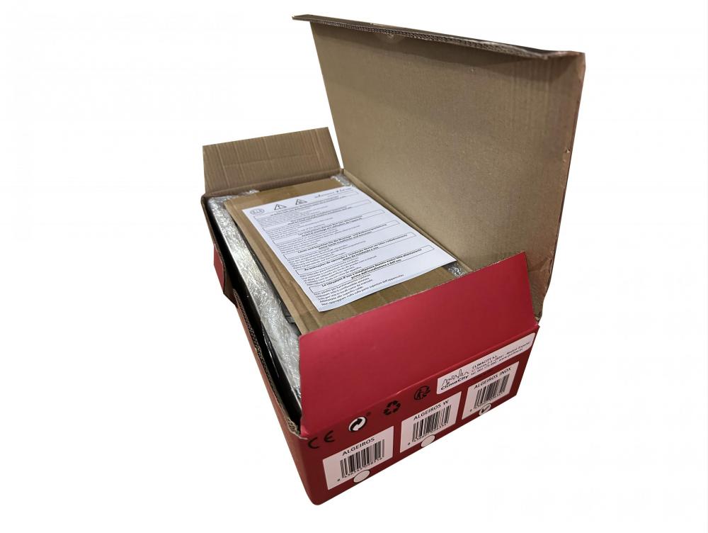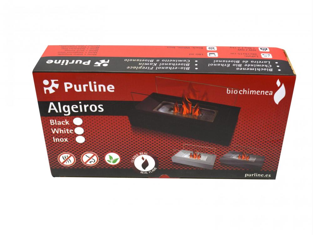 A lareira biológica ALGEIROS é um modelo retangular com uma base de aço e duas telas de vidro temperado que enquadram uma bela chama regulável.