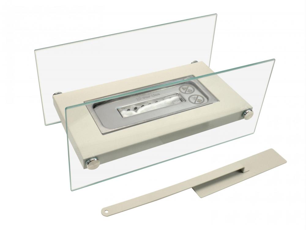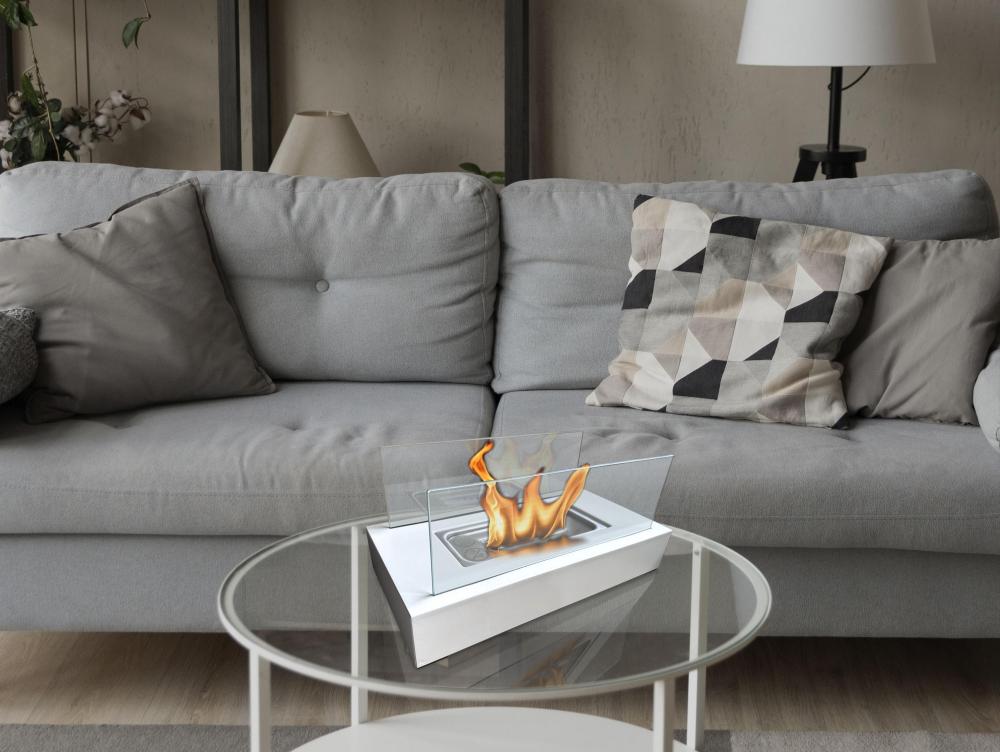 Lareira a etanol em branco. ideal para colocar em superfícies. Tem dois ecrãs de vidro temperado e produz chamas reais. Sem fumo, cinzas ou odores.
