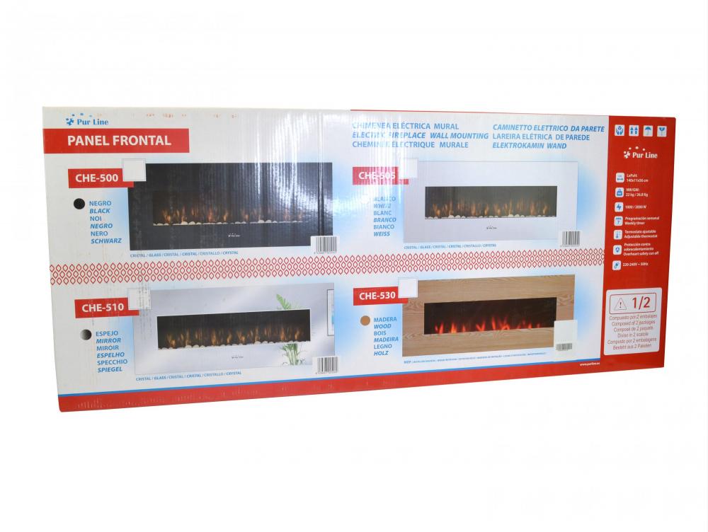 A CHE-530 é uma lareira panorâmica de parede com um design minimalista.Tem um design minimalista na forma de um retângulo extra plano, feito de vidro temperado em MDF curvo na frente, com um sistema LED na lateral e na parte de trás do qual pode escolher 8 cores para criar diferentes atmosferas. Dispõe de um painel de controlo e de um telecomando, que permite controlar a altura e a cor das chamas e regular o termóstato.