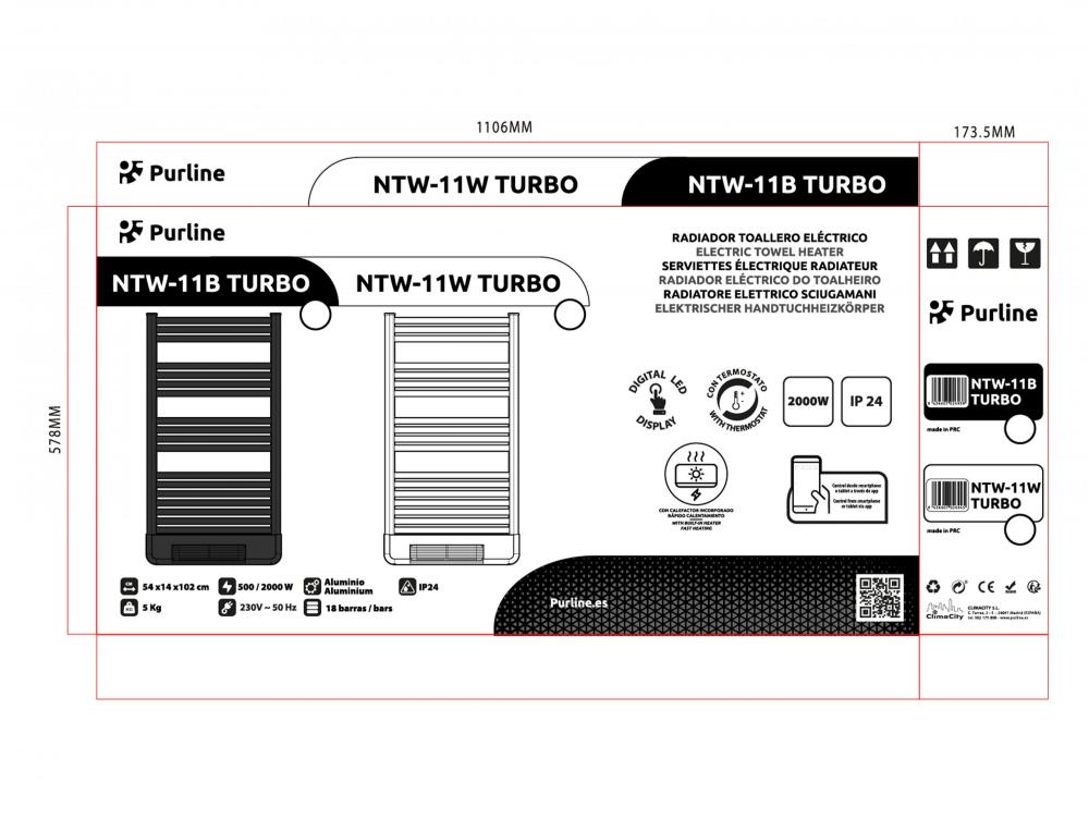 O NTW-11B TURBO é um radiador toalheiro completo com aquecedor integrado que combina design, potência e funcionalidade. Com uma potência total de 2.000W (500W no radiador de alumínio e 1.500W no aquecedor de cerâmica), funciona como um secador de toalhas, aquecedor de roupa e suporte eficaz para o seu sistema de aquecimento.