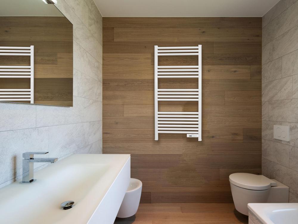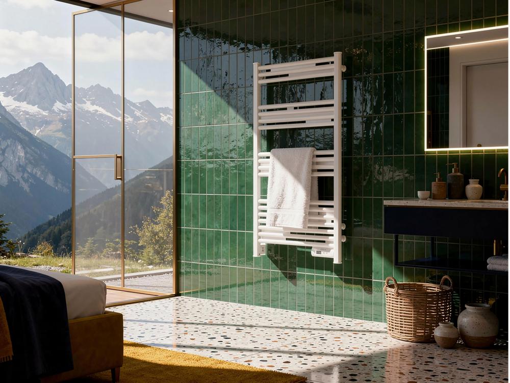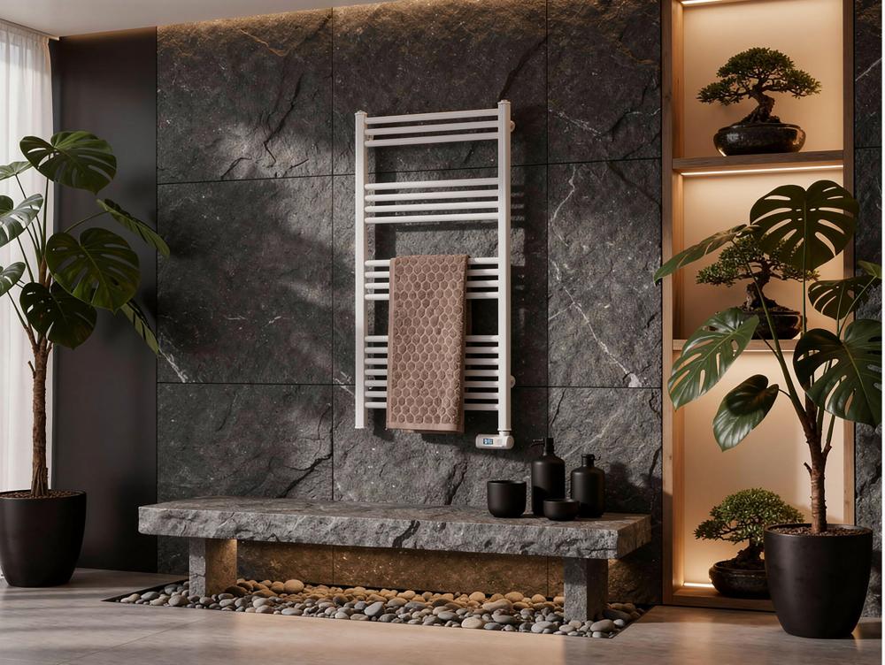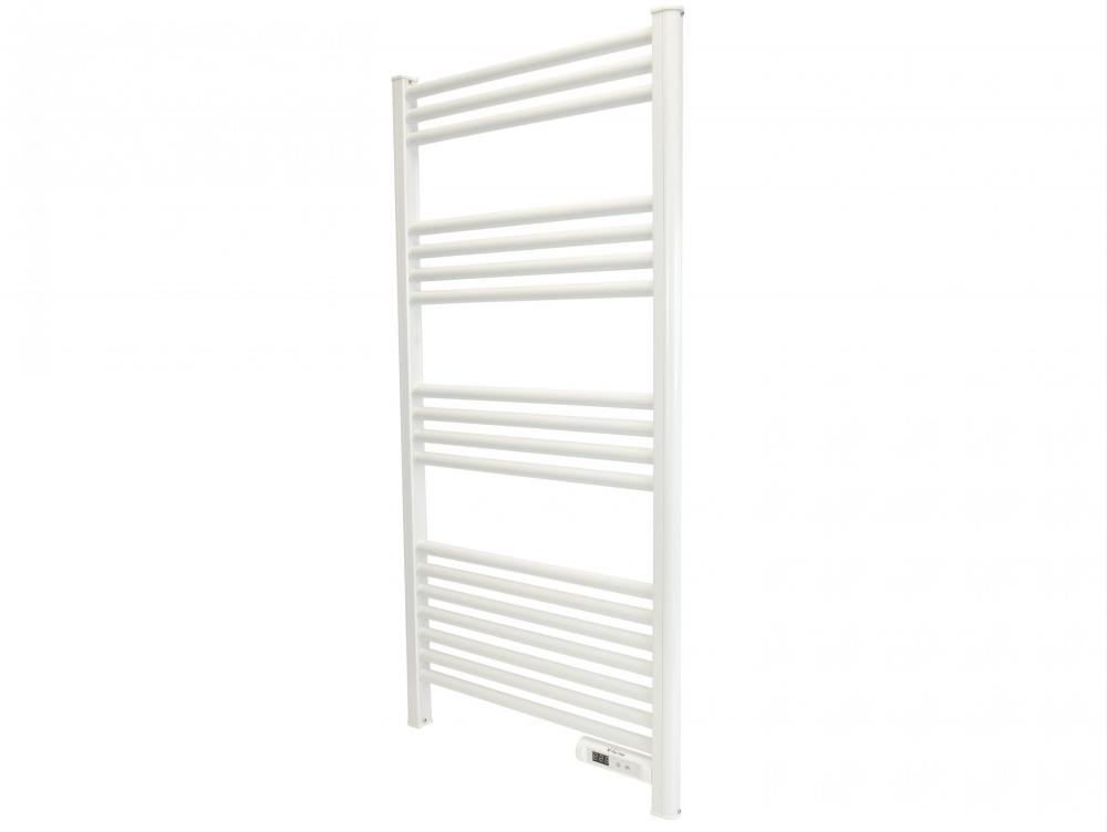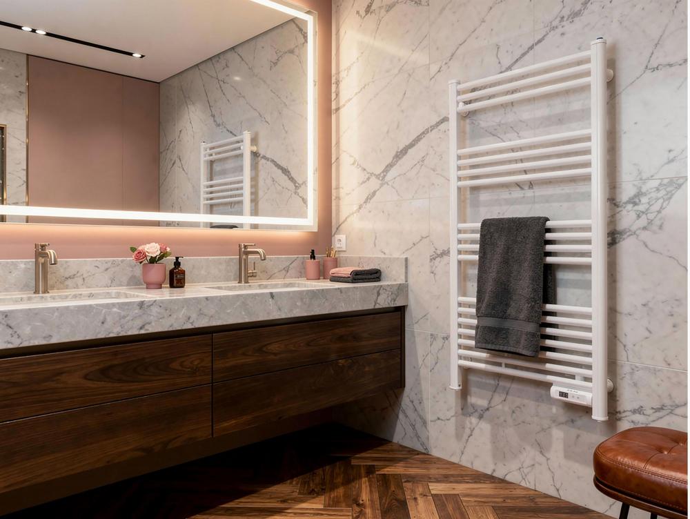 Toalheiro elétrico em alumínio de 500 W. Ecrã LED. IP24. Aquecimento rápido com função 2h. Instalação na parede. Cor branca