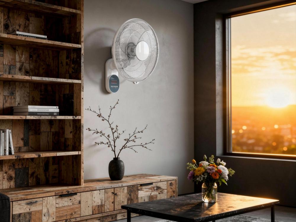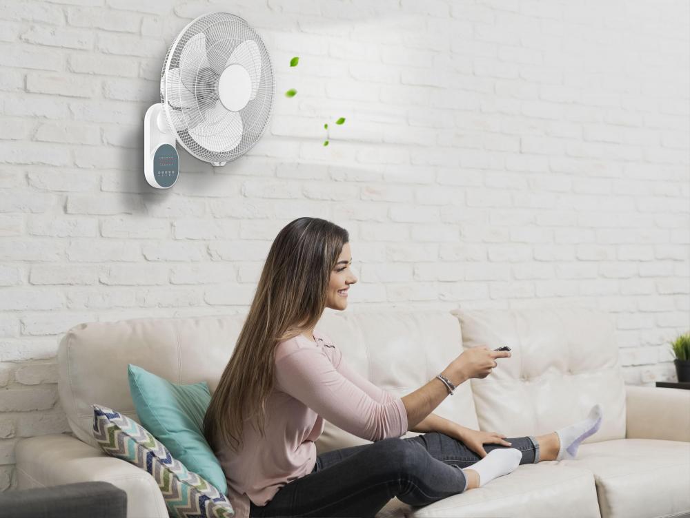 Seu design exclusivo pode ser facilmente instalado na parede, ajustando o ângulo de acordo com suas necessidades. Tem controle eletrônico com 3 velocidades, 3 modos de funcionamento temporizador (7.5h) e oscilação horizontal automática. Este ventilador moderno é de baixo consumo (55W), silencioso e inclui controle remoto.