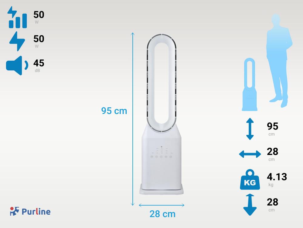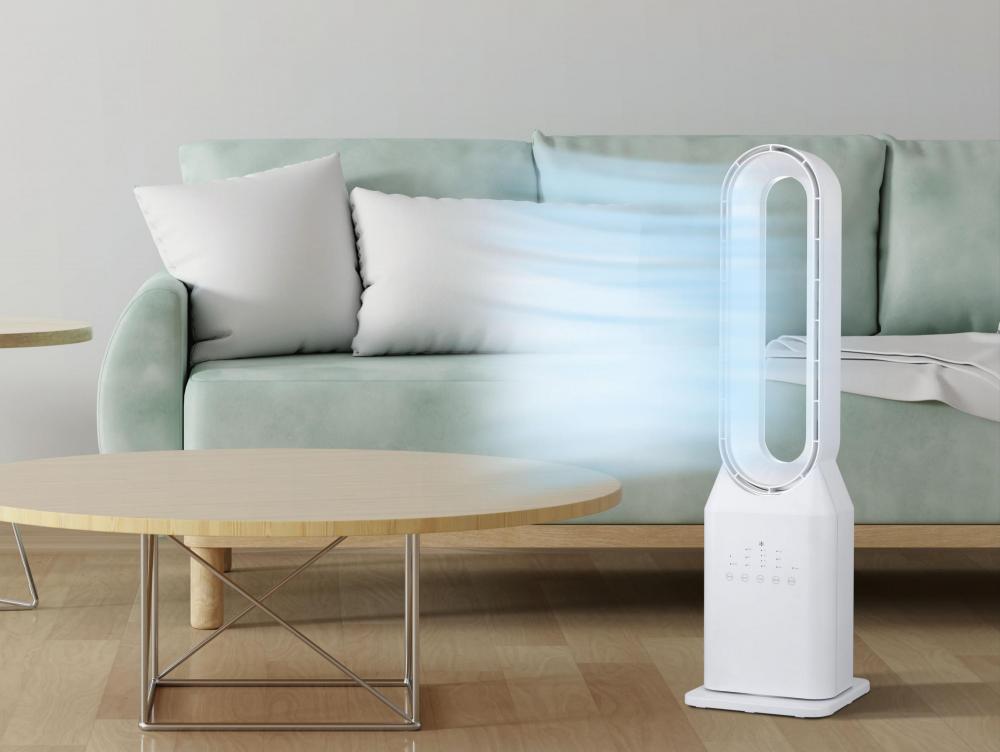 Caracteriza-se porque não tem pás, pelo que o seu funcionamento é totalmente silencioso. Tem um painel eletrônico com 3 velocidades, 3 modos de funcionamento temporizador (7.5h) e oscilação automática. Este ventilador moderno é de baixo consumo (50W) e inclui controle remoto.