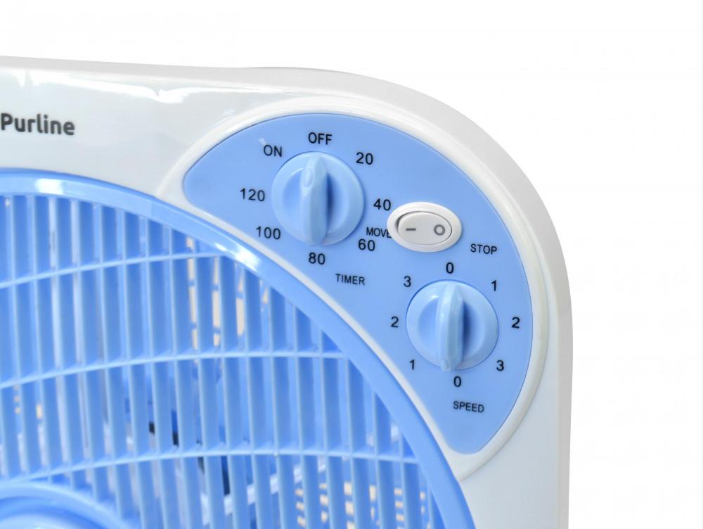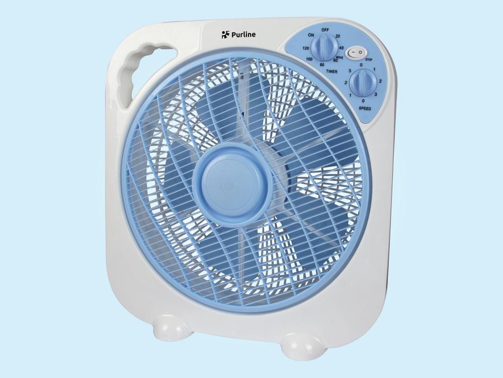 Ventilador de caixa 50W com temporizador. 3 velocidades diferentes. 50W. Temporizador 2h. Oscilação rotativa. Pega de transporte.