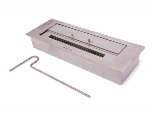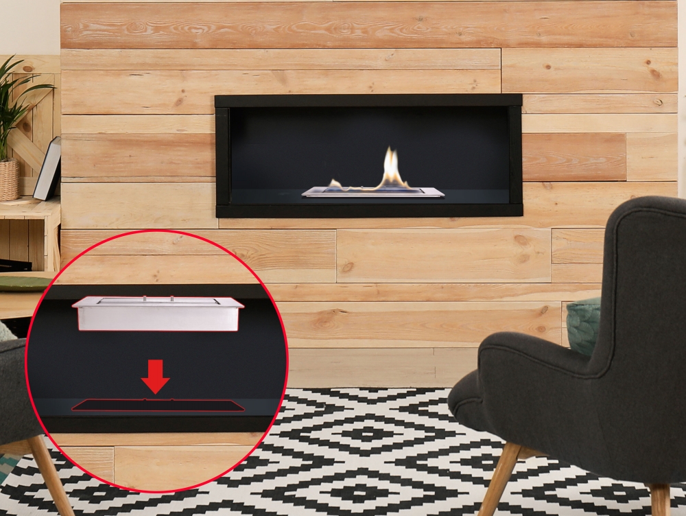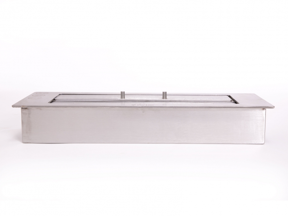 O F9645 é um pequeno bloco de combustão (LxDxH: 48x15x8 cm) e leve (6kg), feito com dupla camada de aço inoxidável e fibra cerâmica no interior para garantir um incêndio seguro. Com um tanque cheio, tem uma autonomia de até 6 horas, aproximadamente. Além disso, a abertura da sua tampa permite-lhe regular a intensidade das chamas, para que possa personalizar a atmosfera de acordo com as suas preferências, e quando quiser parar o fogo pode utilizar a sua ferramenta de extinção.