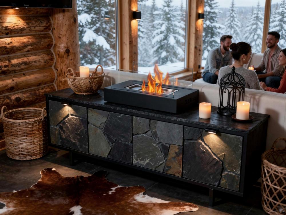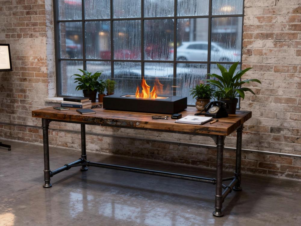 Lareira a etanol. ideal para colocar em superfícies. Tem duas telas de vidro temperado e produz chamas reais. sem fumo, cinzas ou odores.