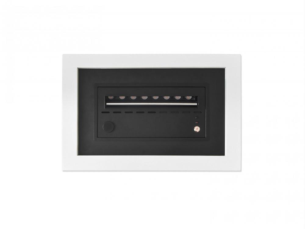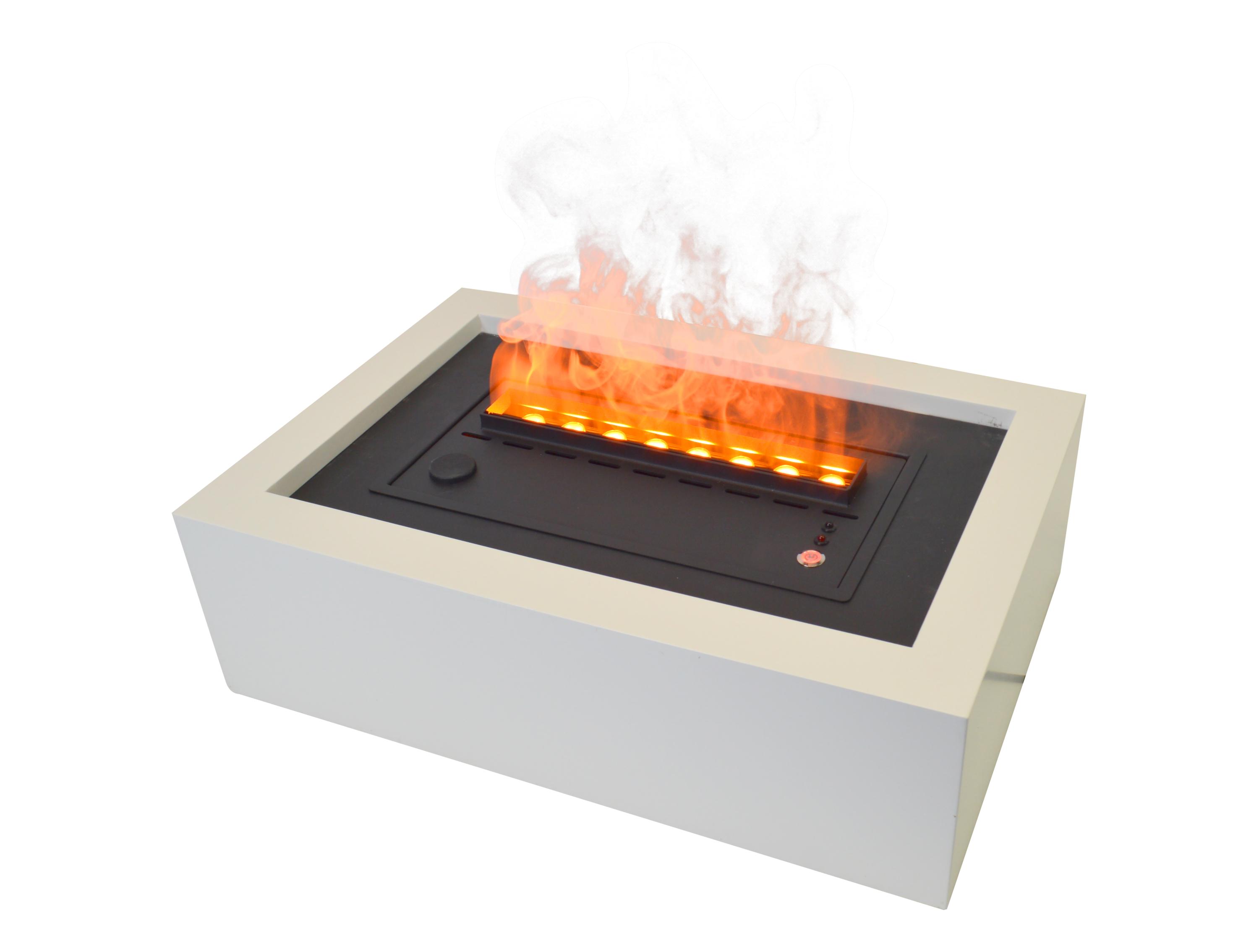 Imitação de fogo hiper-realista sem emissões de fumo e de gás. Corpo metálico adicional em branco. Caudal máximo de 100 ml/h. Autonomia: 5-8 horas. Aviso de depósito vazio. Controlo remoto. Depósito de água 1,5L. Led cor de laranja