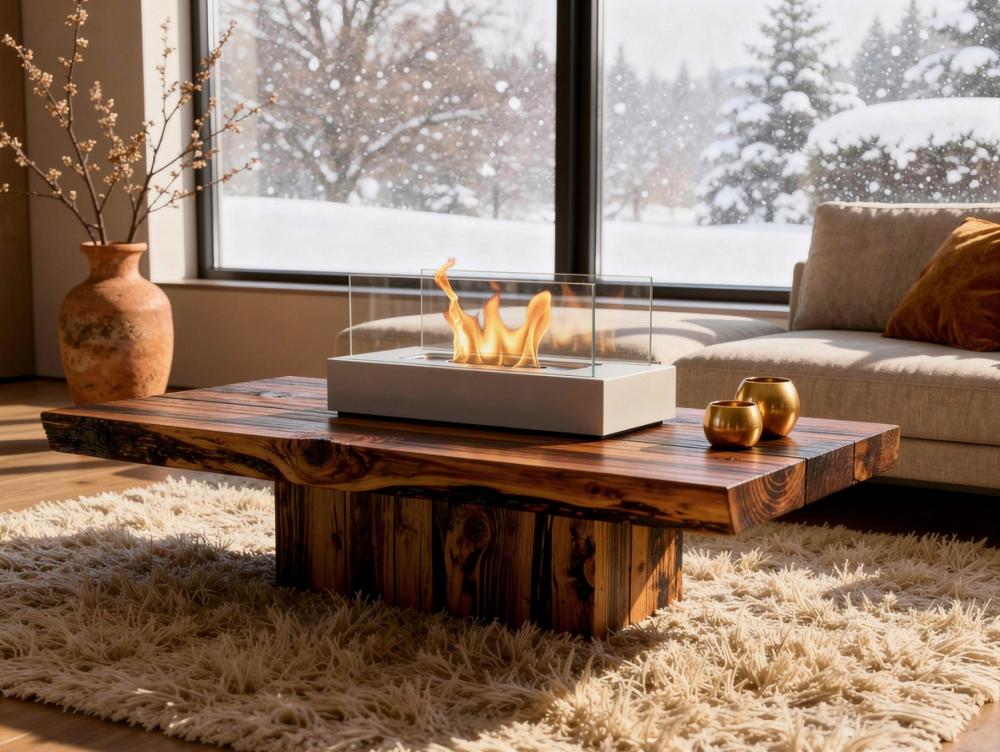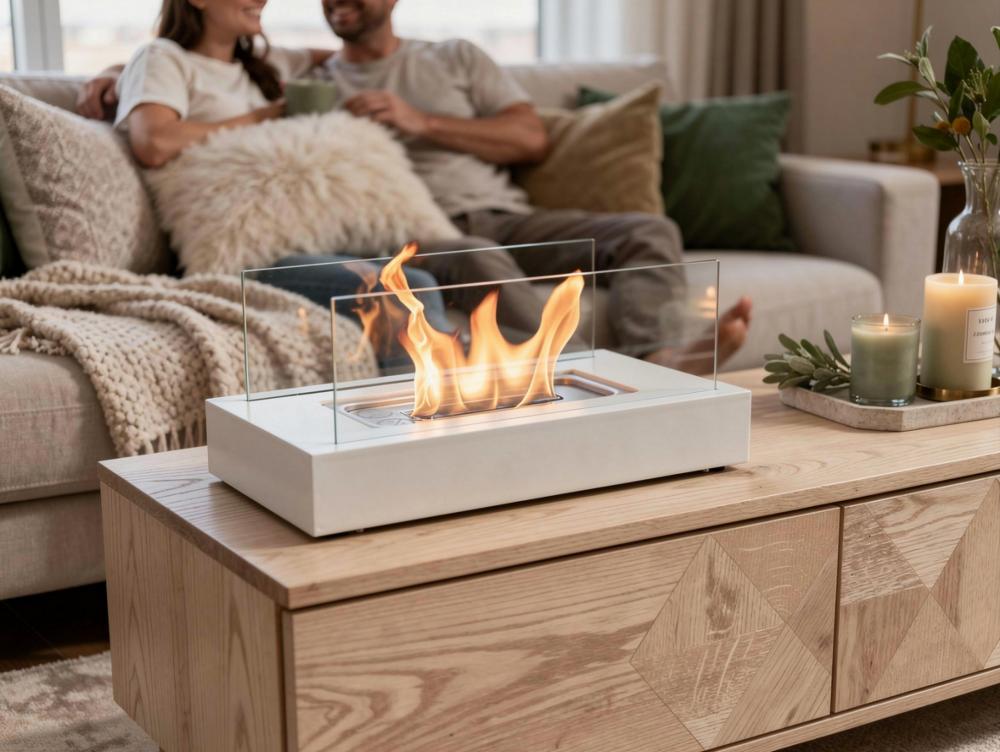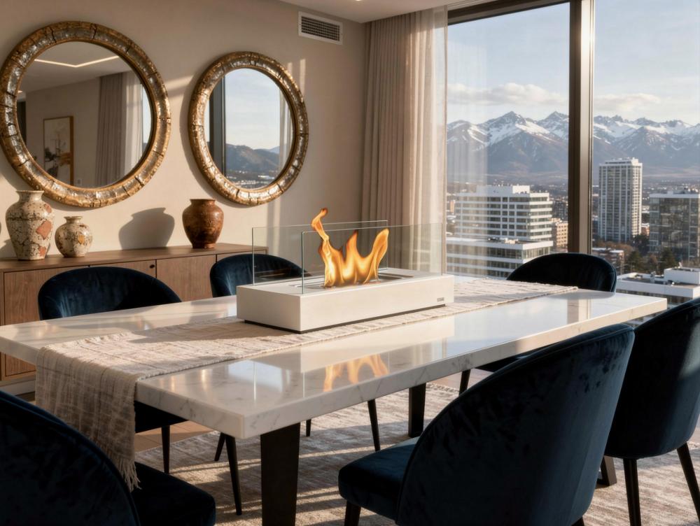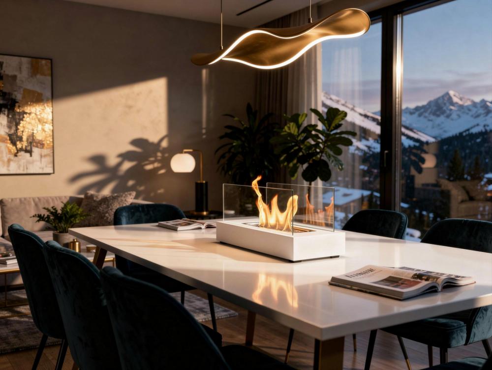 Lareira de mesa a etanol com dois lustres de vidro temperado